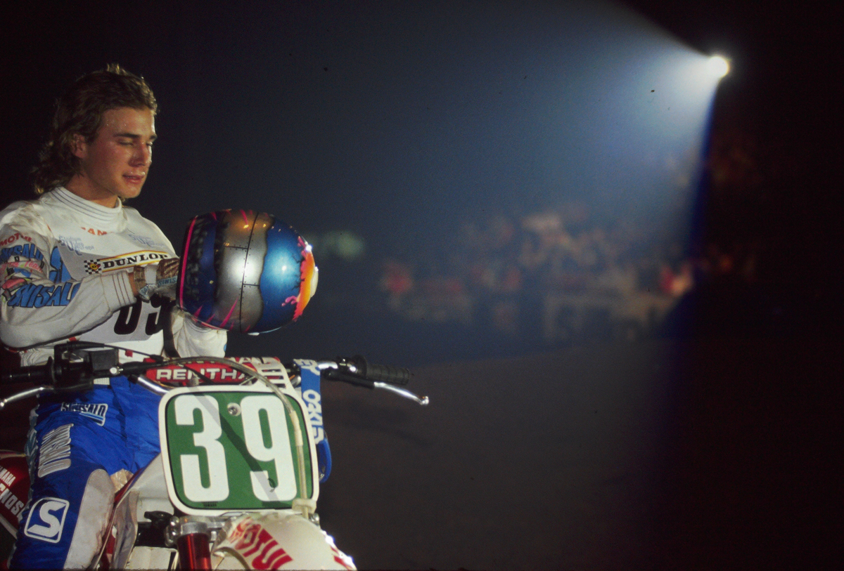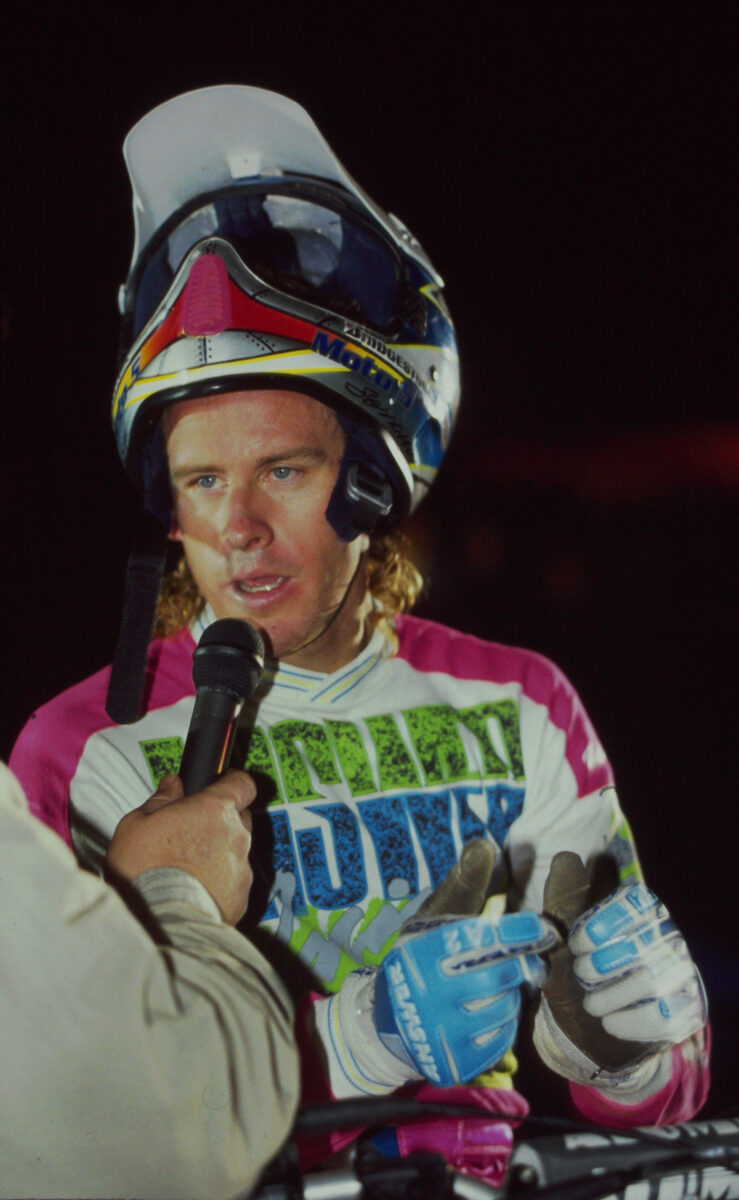 Top of the bill was the undoubted megastar of American motocross and Supercross, Ricky Johnson. Although hampered by a wrist injury that would later curtail his career, the 25-year-old Californian “Bad Boy” was already a global icon, with seven AMA titles to his name including the 1986 and 1988 Supercross Championships. Asked to address the crowd during the disruption, Johnson later admitted: “I had heard all about crazy English soccer fans in the 1980s, so I was a bit scared to ask them all to move in case they came and beat the crap outta me!” As ever, his natural showmanship quickly won the NEC crowd over.