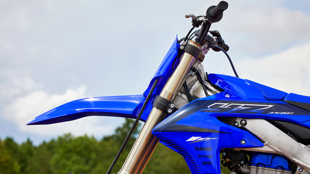 The new flatter seat also adds to the ride experience and surprisingly, you feel sat in the bike and part of it even though, in theory, you’re more sat on top of it, even with 10mm more distance between the top of the seat and the footpegs and the overall seat height 5mm higher. The four-position adjustable handlebar mounts offer up plenty of scope depending on your size. The bike definitely feels more compact in general, with Yamaha being bold enough to say it ‘feels like a 125’. They’re not far wrong but like I said, with it being a 4 stroke and the engine characteristics it’s closer to a very fast and nimble 250F.