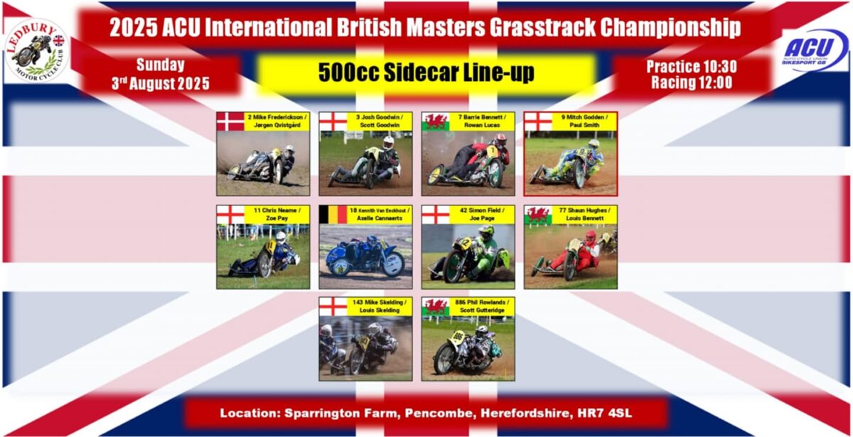 For the first time at a Masters event, the 500cc Sidecars will be coming to the tapes with Mitch Godden/Paul Smith looking to make it five consecutive titles. In 2025, Godden’s challengers will include crews from not only England but also Belgium, Denmark and Wales. For this Sunday, the only other rider in the entry to have enjoyed title success is Josh Goodwin, victorious on six occasions with Liam Brown in the chair. Josh last tasted glory in 2018, and he now has his cousin Scott Goodwin as a passenger. The other English crews on duty at Ledbury will be Chris Neame/Zoe Pay, Simon Field/Joe Page and Mike Skelding/Louis Skelding. Representing Wales and sure of some big support from just over the border are Barrie Bennett/Rowan Lucas and Shaun Hughes/Louis Bennett, who have made a welcome and strong return to action in 2025 after a lengthy lay-off due to injuries sustained at a European event. Carrying the International challenge in the 500cc sidecars will be Danish crew Mike Frederickson/Jorgen Qvistgard and Belgians Kennith van Eeckhout/Axelle Cannaerts. In this one, it will be particularly interesting to see how Dane Frederickson fares as a regular competitor at European Championship level.