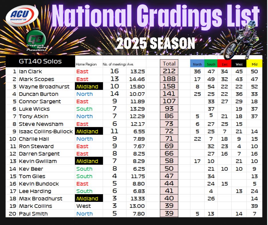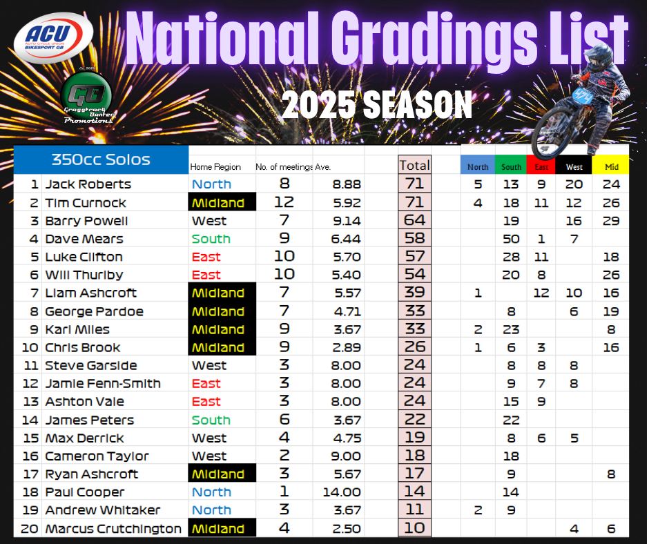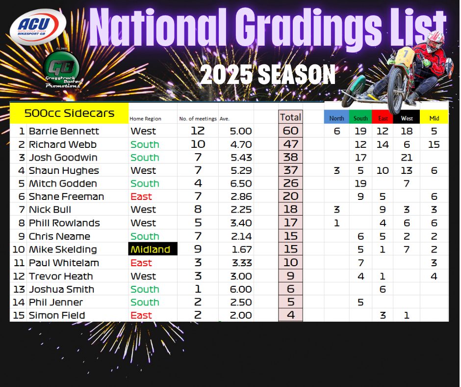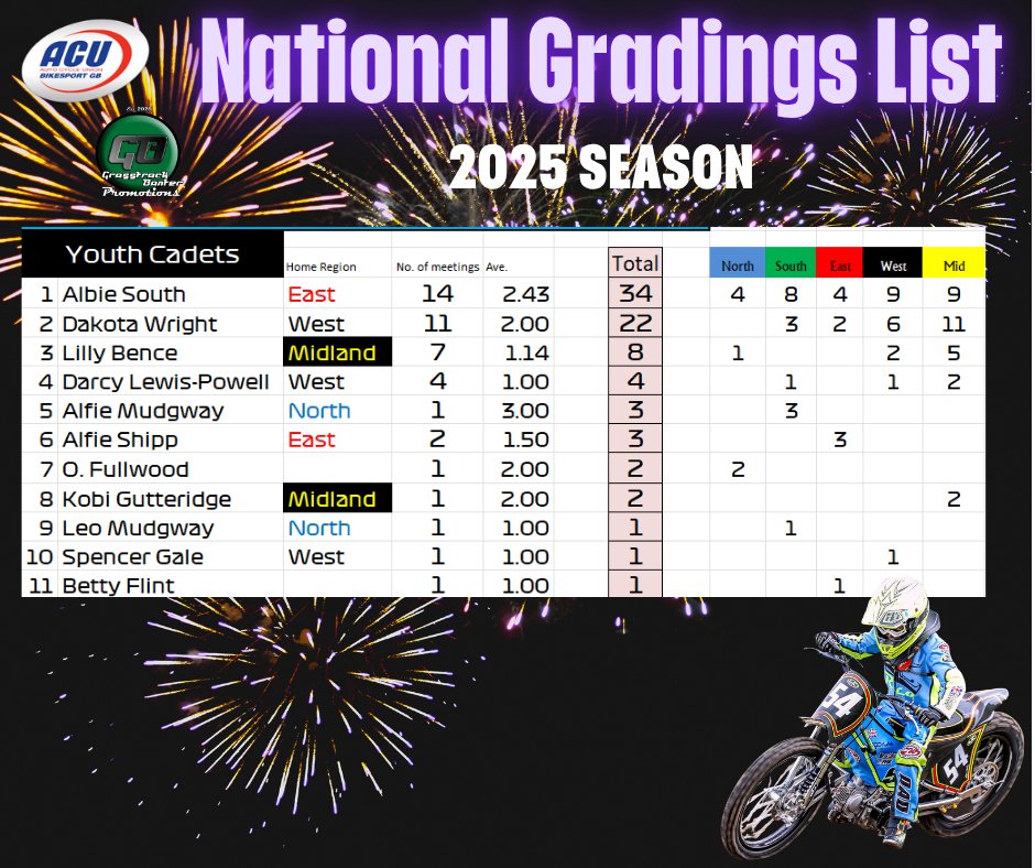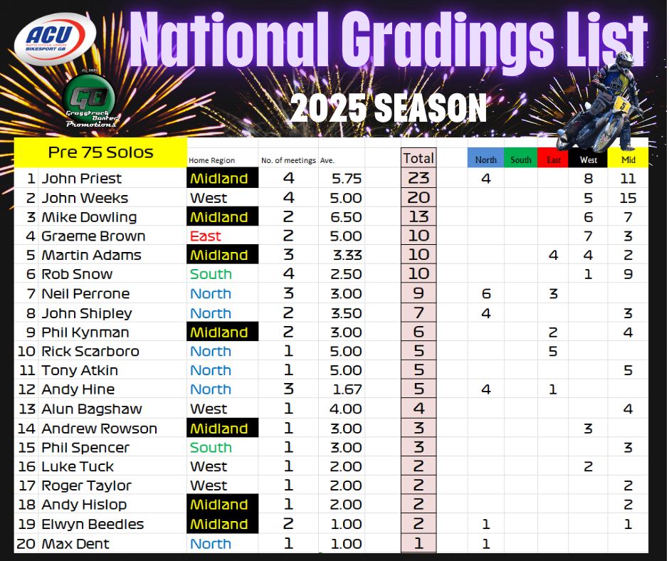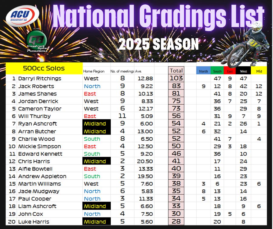 Gareth Bemister has been working the midnight oil and has completed and posted the 2025 British Grasstrack National Gradings list, which was compiled from the 38 meetings that took place across the country this year.