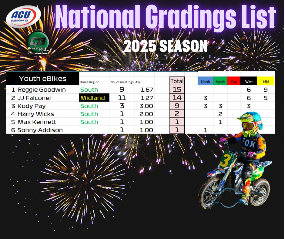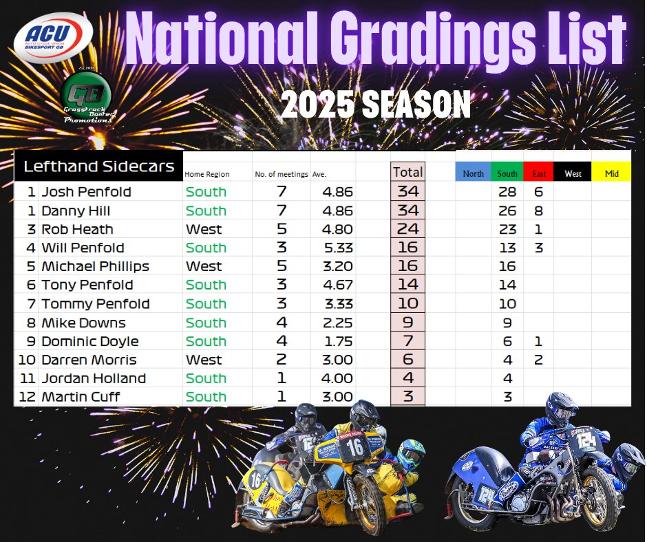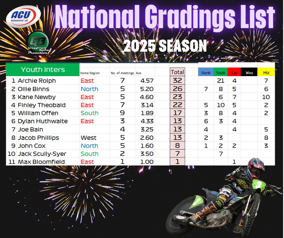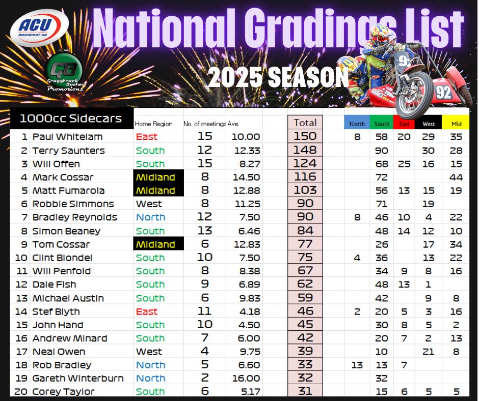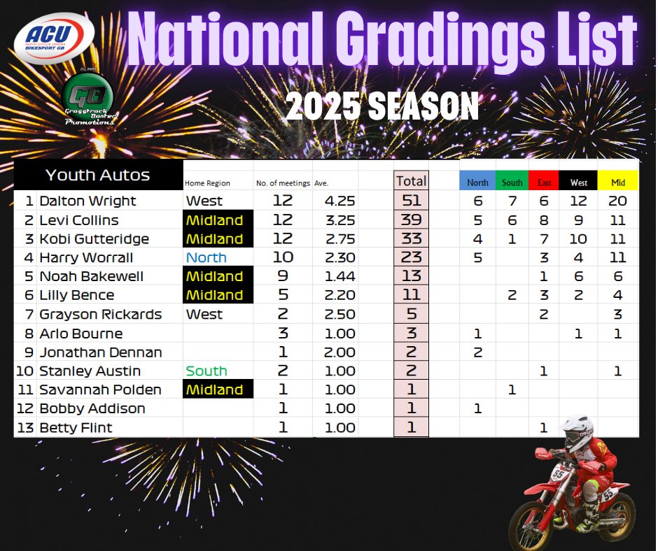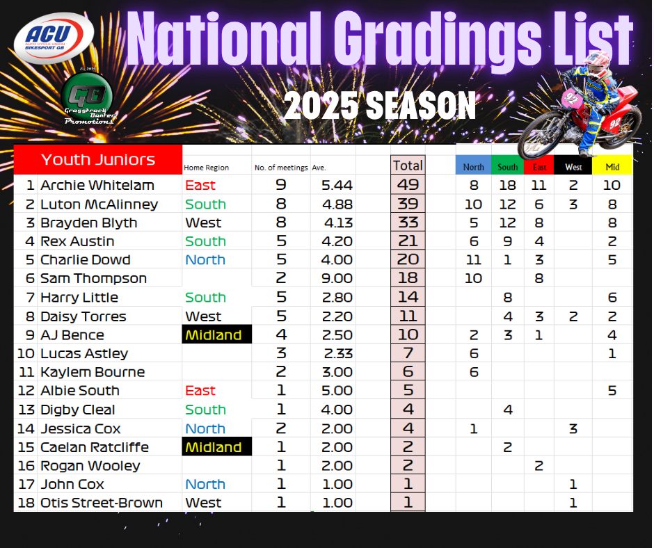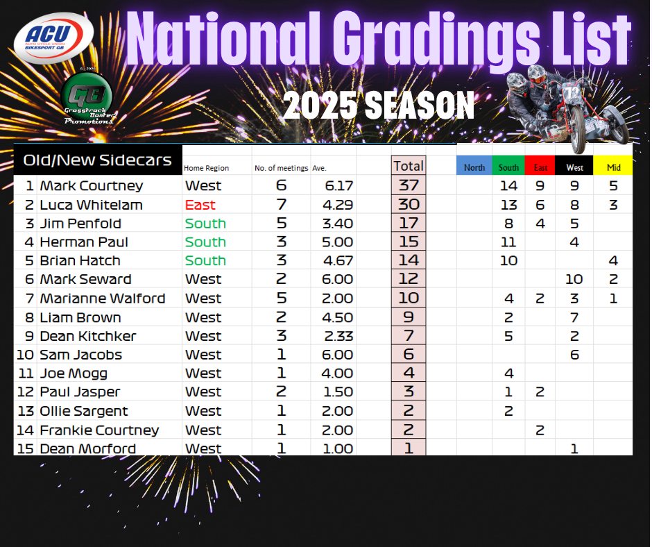 Gareth Bemister has been working the midnight oil and has completed and posted the 2025 British Grasstrack National Gradings list, which was compiled from the 38 meetings that took place across the country this year.