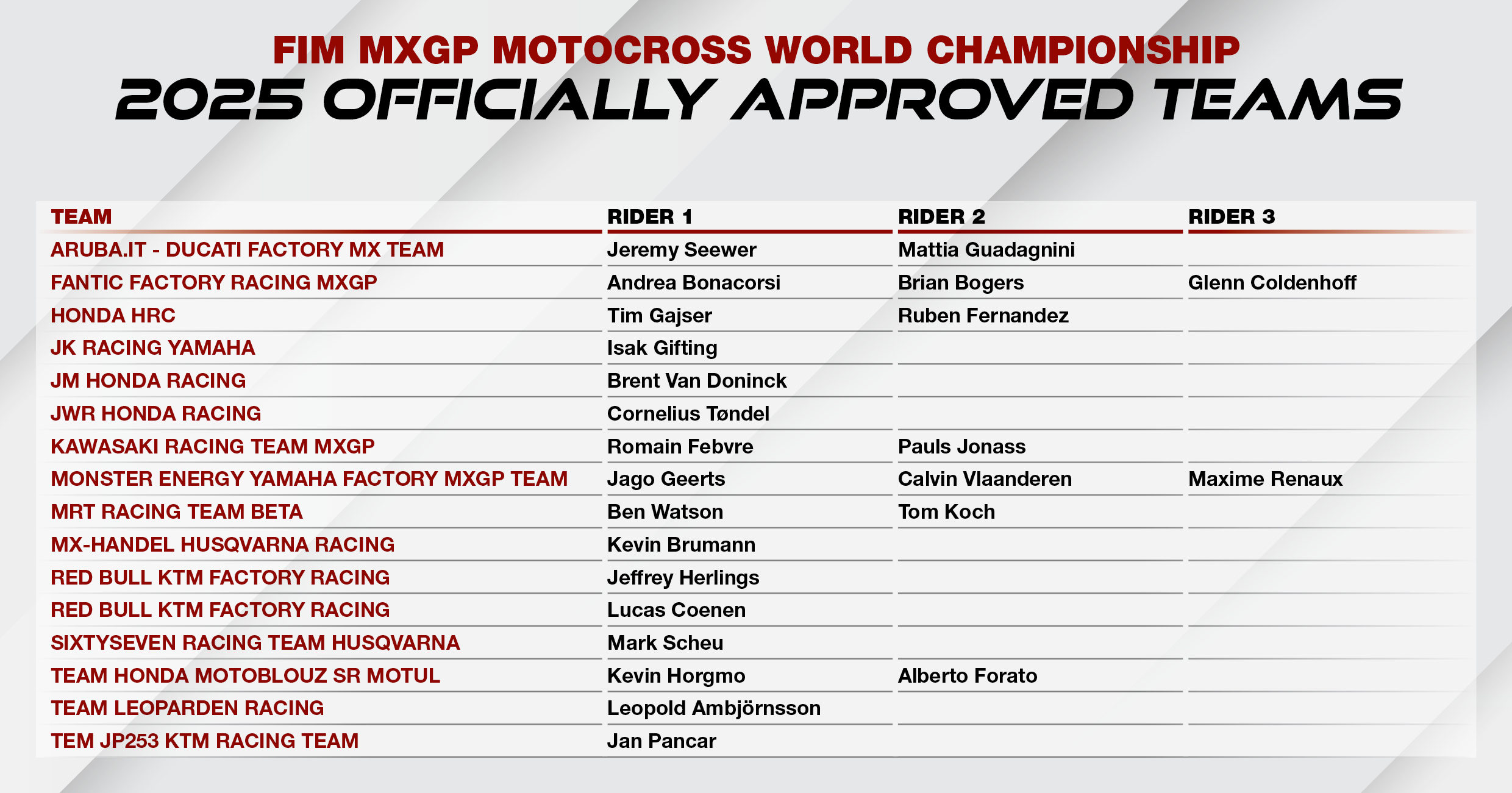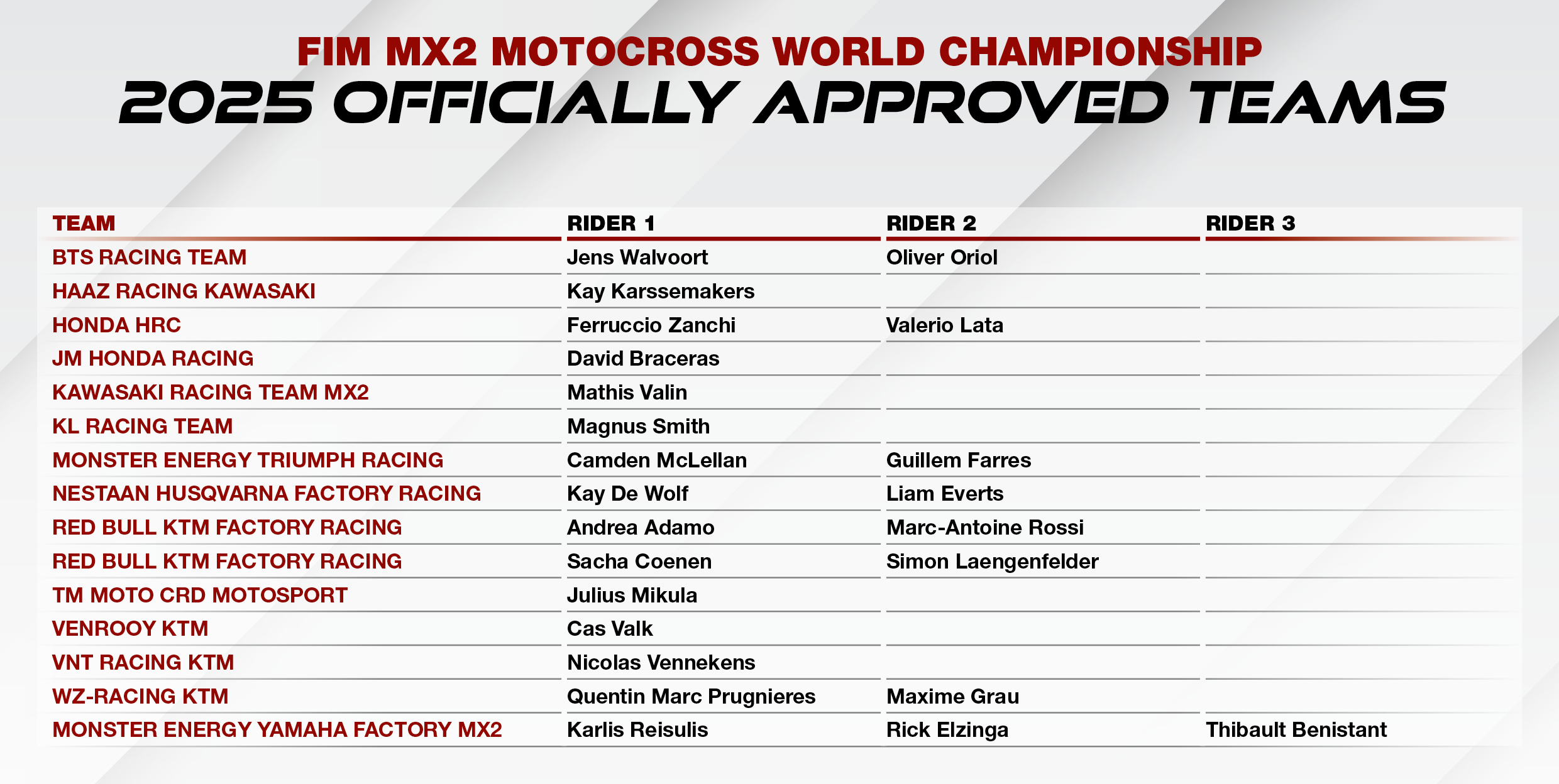 Infront Moto Racing is pleased to reveal the officially approved teams list (OAT) for the 2025 FIM Motocross World Championship!