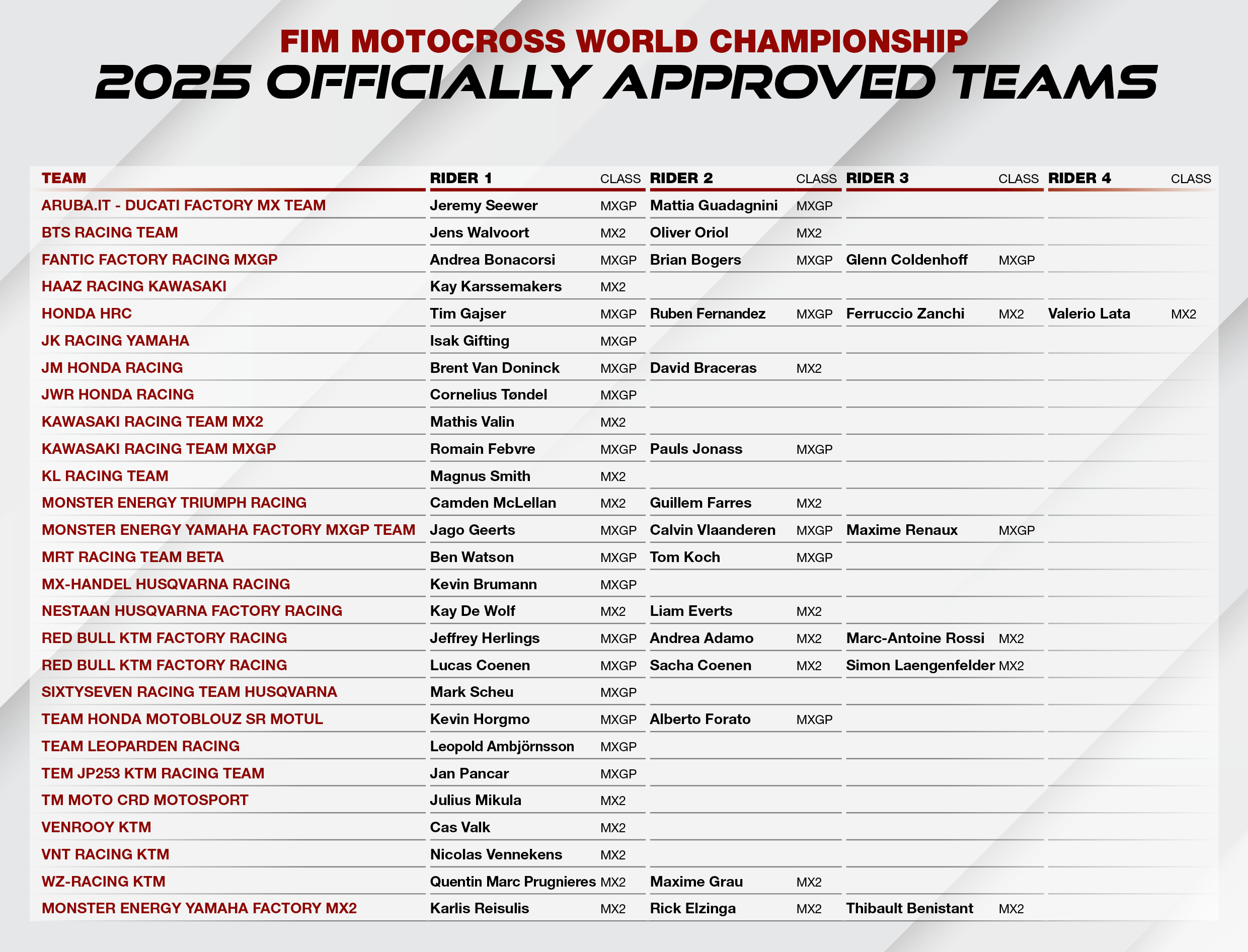 The full 2025 MXGP & MX2 teams list can be viewed below: