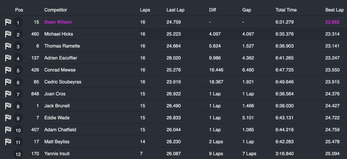 | Pos | Competitor | Diff | Laps | Best Lap |