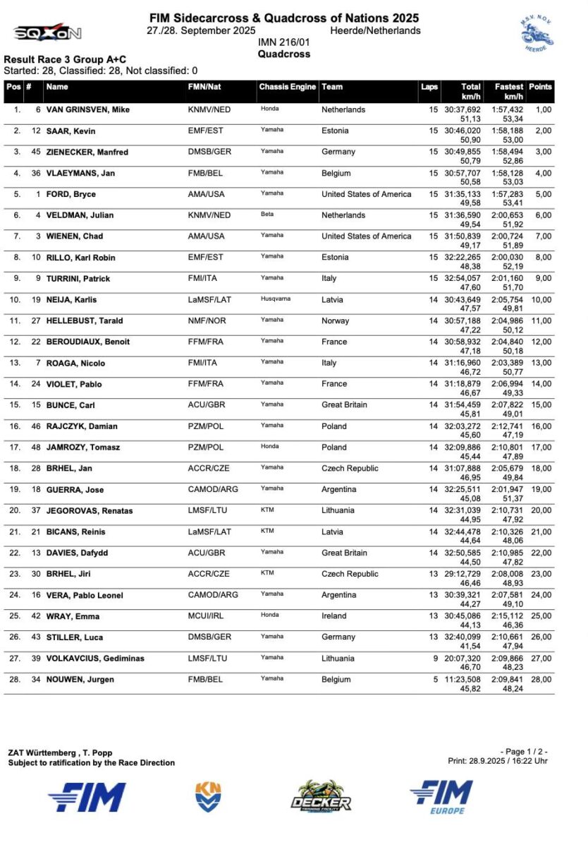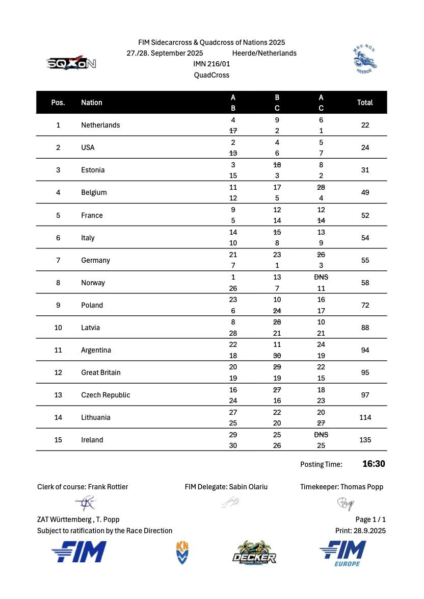 Team Netherlands has won the 2025 Quadcross of Nations on home soil in Heerde today, beating the multi-time champions, the Americans, who finished second, and Estonia, which came in third.