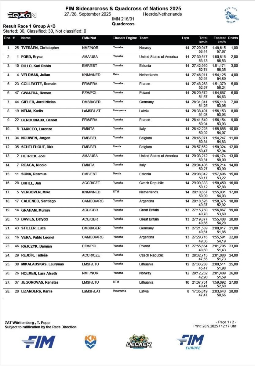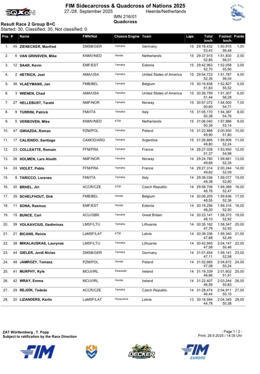 Team Netherlands has won the 2025 Quadcross of Nations on home soil in Heerde today, beating the multi-time champions, the Americans, who finished second, and Estonia, which came in third.