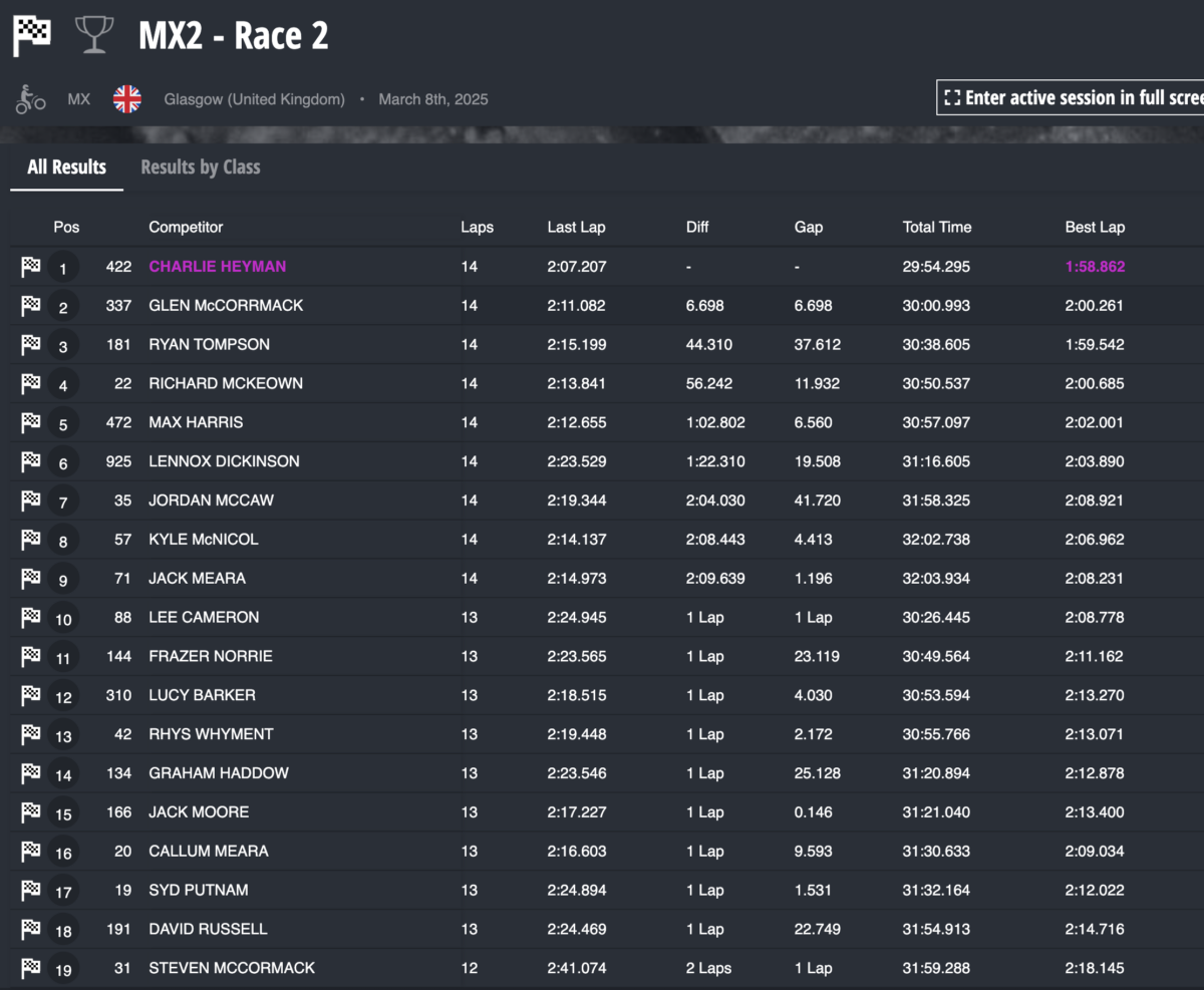 MX2 saw Charlie Heyman rattling off two fine victories for the overall, ahead of Glenn McCormick in second and Max Harris riding a blinder in third.