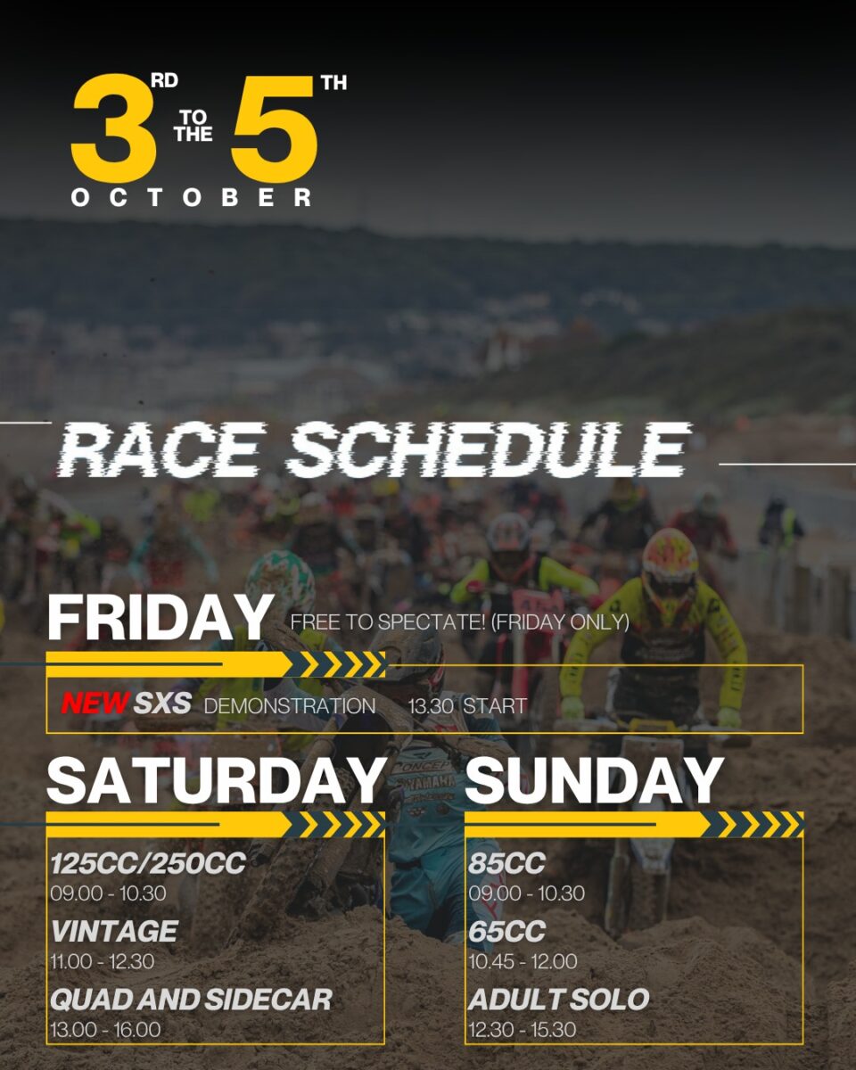 Rewinding to Saturday, the race action begins at 9 am when the Youth 125/250 riders take to the sand, followed by the Vintage race at 11am. Then the Quad and Sidecar racers duke it out at 1 pm in a 3-hour marathon, where World Sidecarcross No3 Brett Wilkinson & Joe Millard will be looking to get their hands on the trophy, but they will have to contend with the likes of reigning champs Alun Davies and James Ferguson and their Team GB mates Michael Hodges and Ryan Henderson.