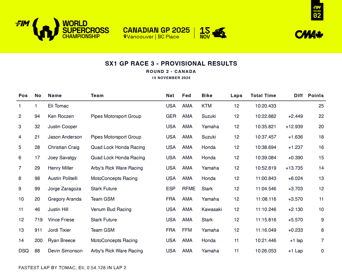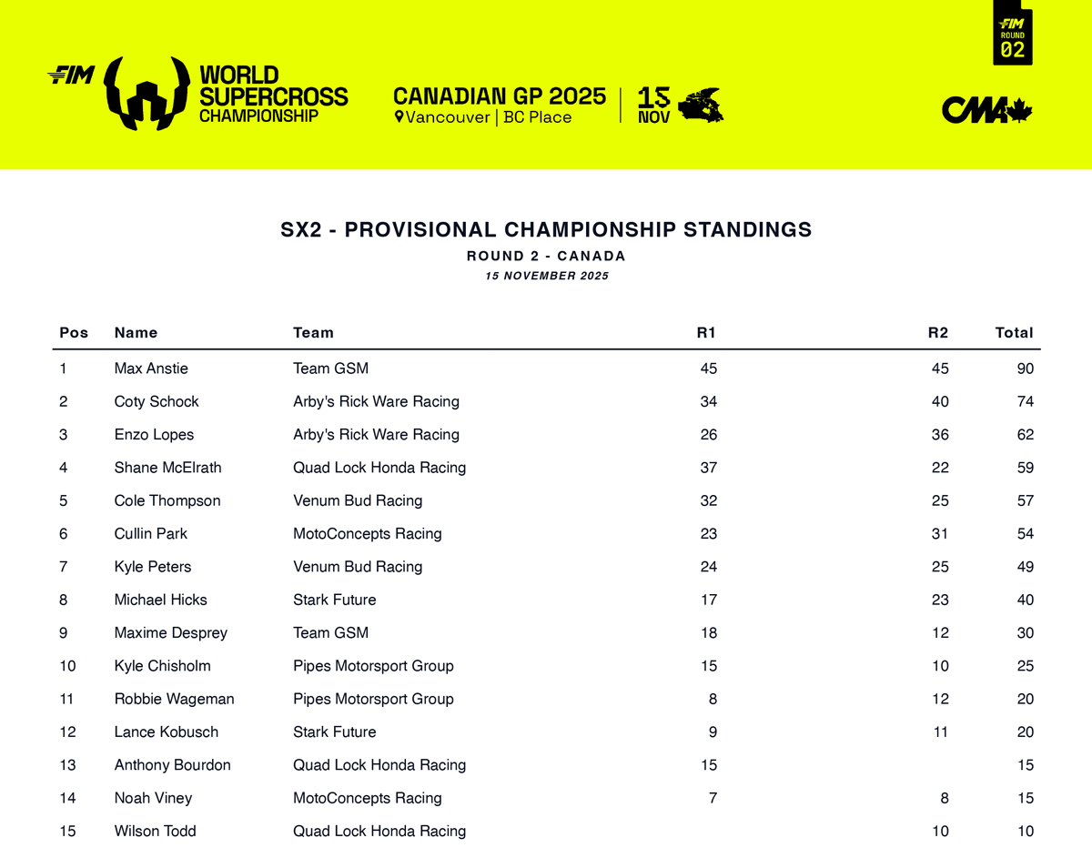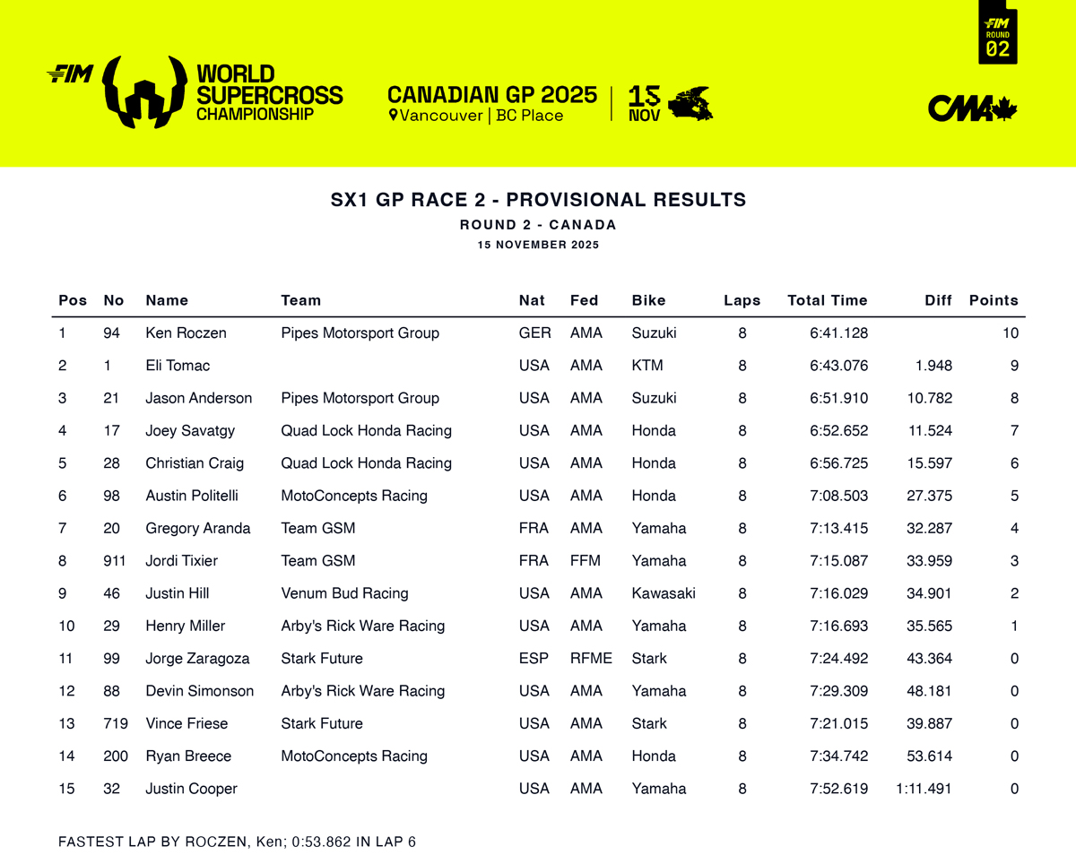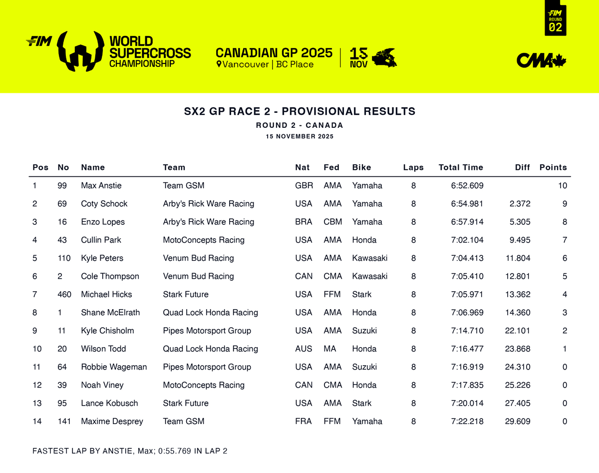 Catch up with the full set of results from last night’s 2025 World Supercross Championship Round 2 from Vancouver…