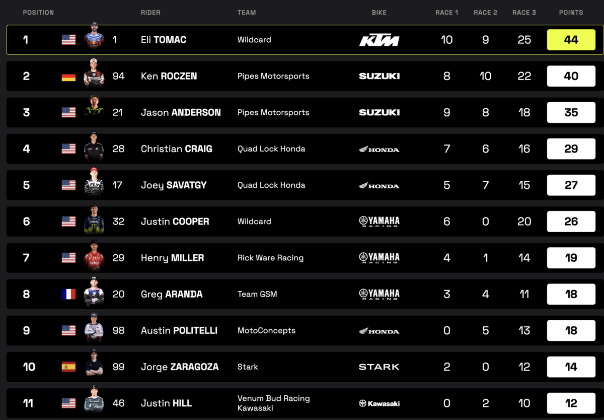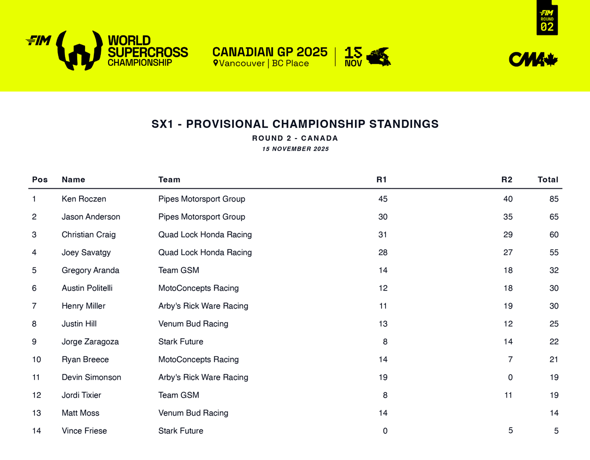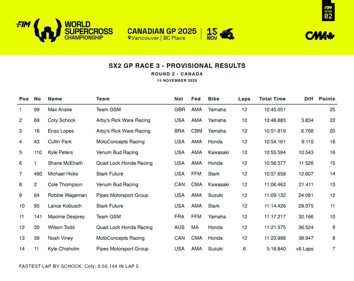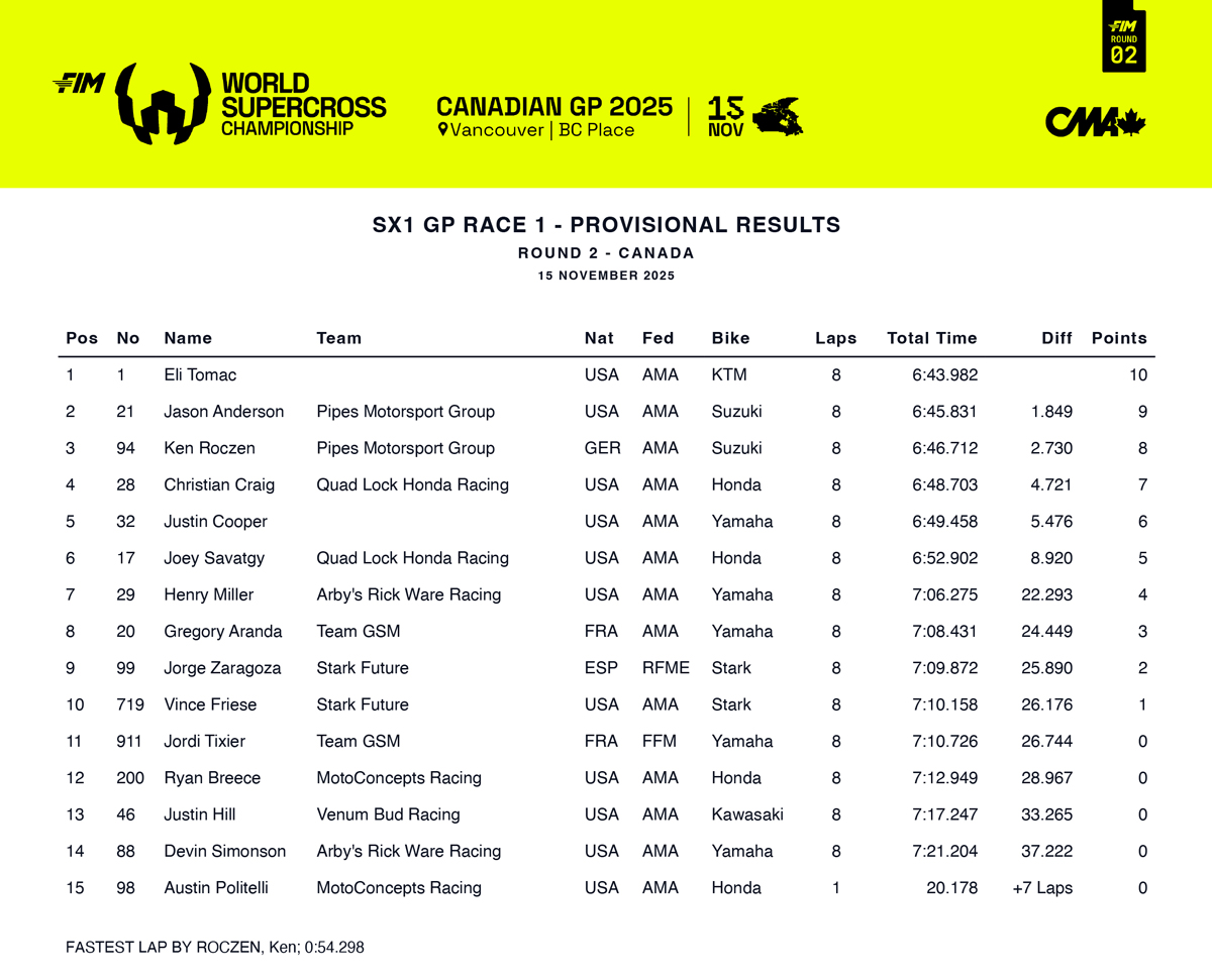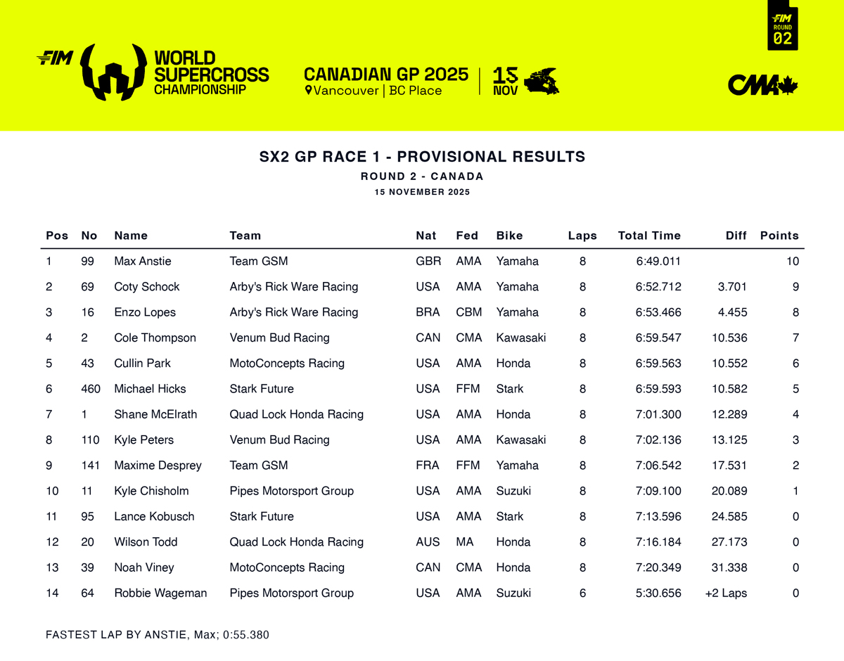 Catch up with the full set of results from last night’s 2025 World Supercross Championship Round 2 from Vancouver…