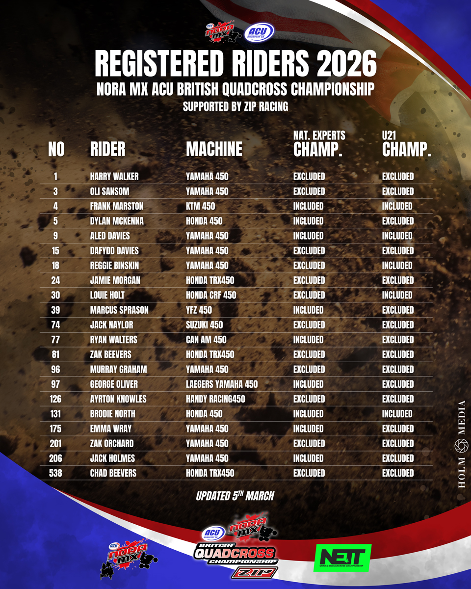 The Provisional registered rider lists for the 2026 Nora MX ACU British Quadcross Championship, supported by Zip Racing, have been released, and there is plenty of talent on there to challenge reigning Champion Harry Walker as he looks to make it back-to-back titles.