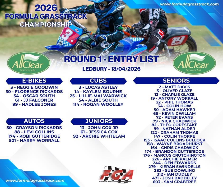 The meeting takes place at the club’s Sparrington venue, near Pencombe in Herefordshire, HR7 4SL. Formula Grasstrack will also running their first event of 2026 at the venue the day before.