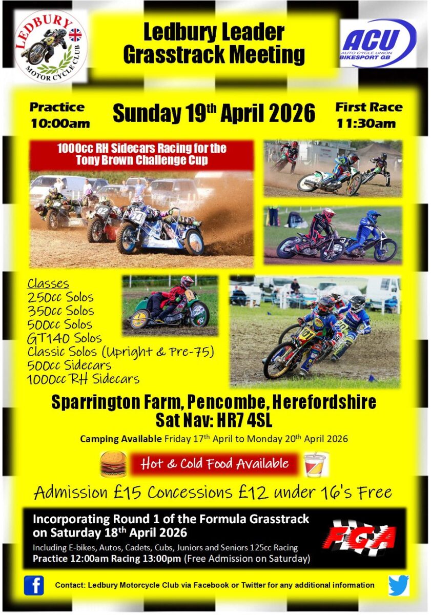 The Ledbury Motorcycle Club have revealed the Rider List for their 2026 Ledbury Leader Grasstrack, which takes place this Sunday, 19th April, and it’s a stellar line-up for what is always one of the best meetings of the season.