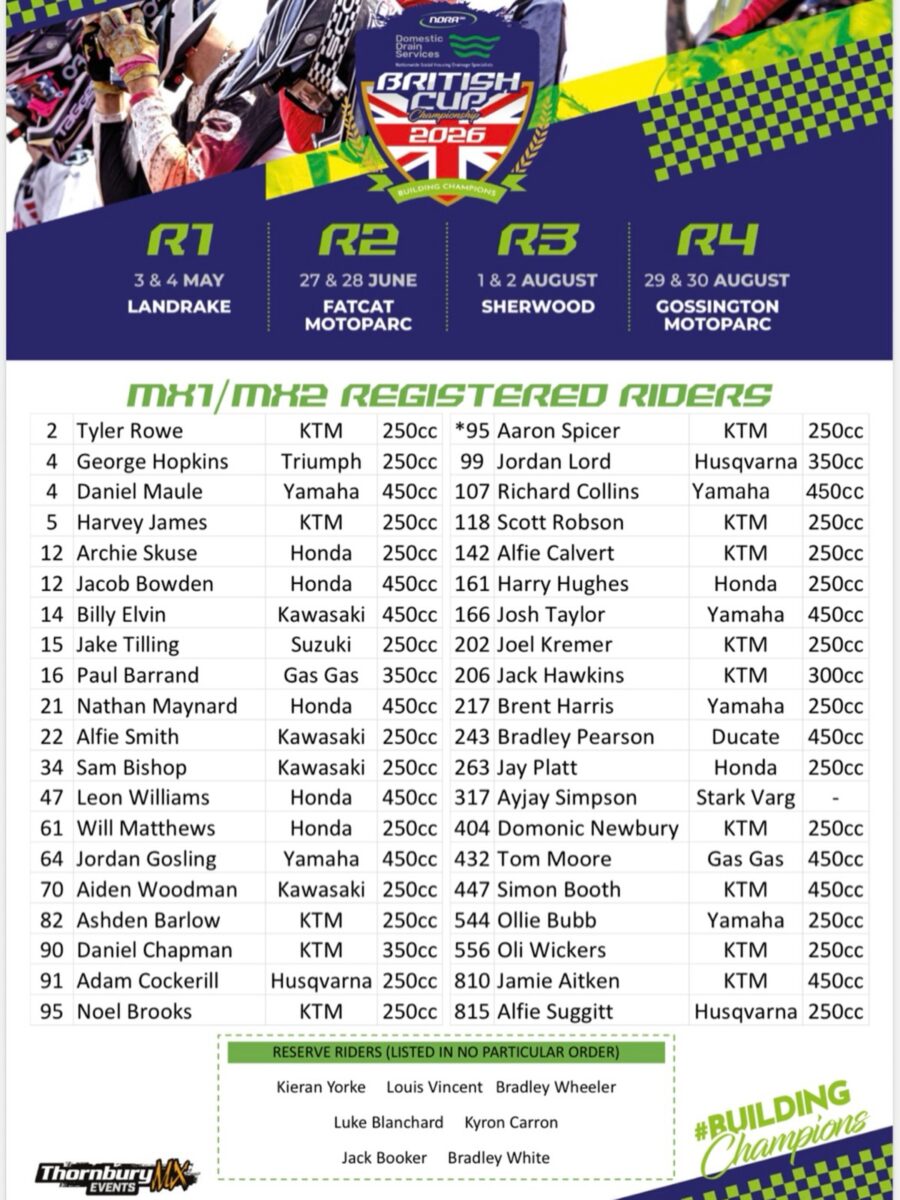 Today, they have released their MX1 and MX2 registered riders, which are detailed below: