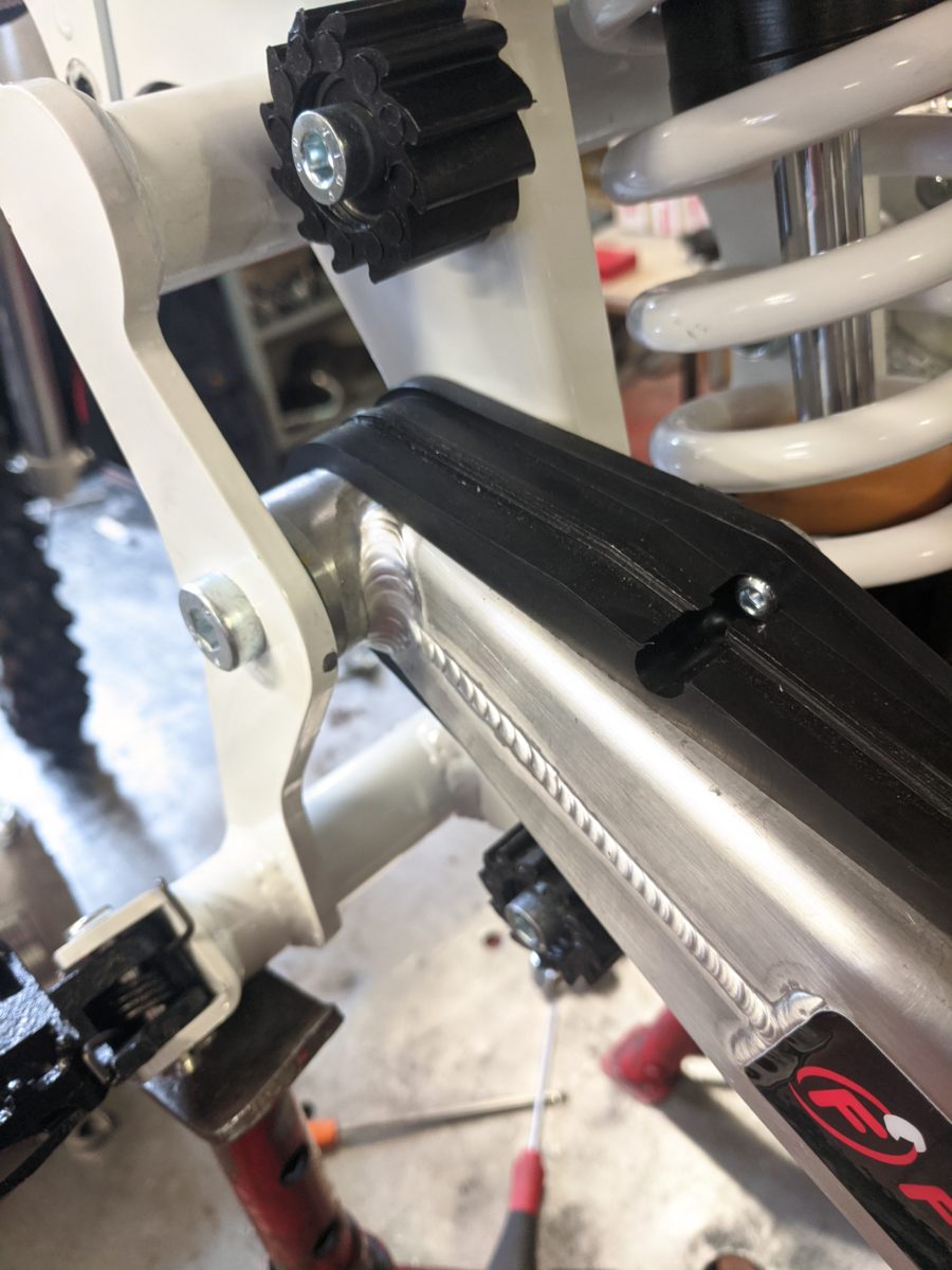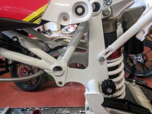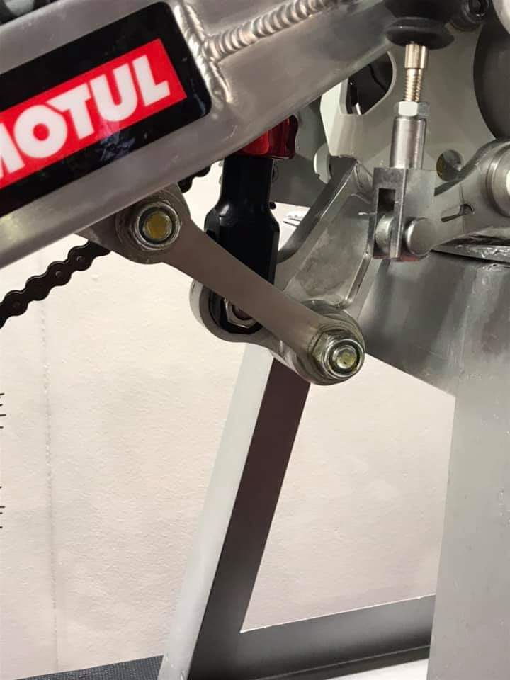 – The pivot point was the main focus for the linkage/swingarm. The pivot bolt has now been split into 2 so you have a nut and bolt each side of it. The smaller bearing can be upgraded to a needle roller bearing which is very strong and similar to a Japanese bike, but that wasn’t the main reason for the smaller bolt. The smaller bolt means the pivot point has been moved forward closer to the front sprocket, this ensures the chain tension is always correct (if chain is adjusted correctly) so the chain is correct through the whole rear shock stroke. This also allows for less wear on the chain slider which was a problem on the f15/15r which has now been eliminated. This also saves on bearing wear.