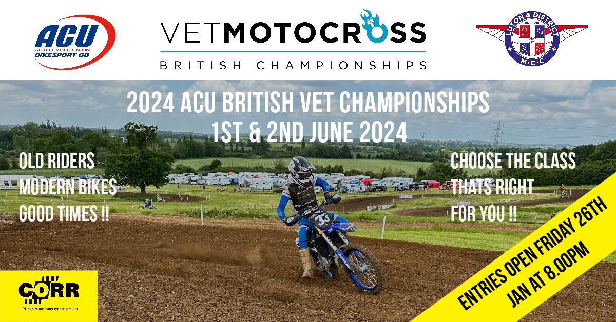 The ACU British Vet Championships gives older motocross riders the opportunity to race at an official ACU British Championship race meeting with the fastest riders having the chance to compete for an Official ACU British title. The event will take place on 1st and 2nd June 2024 at Luton and Districts home track Toddington. The natural hillside track which is located just off Junction 12 of the M1, provides an “old school” challenge that is enjoyable for riders of all ages and all skills. There are a variety skilled based classes for +30, +40, +50 and plus 60 competitors ensuring that riders get to race with people who are of similar speed and age to themselves, making the racing closer and more enjoyable for all. Eg If you are Over 50 you can either enter the Championship Class, the Intermediate Class or the Novice Class depending on your skill level.