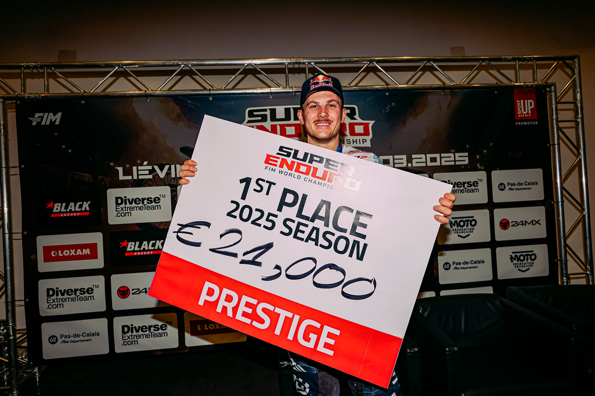 The seventh and final round of the 2024/2025 FIM SuperEnduro World Championship in Liévin, France, saw Billy Bolt cap off his title-winning season with a perfect night, taking SuperPole and all three Prestige class race wins. Meanwhile, Marc Fernandez Serra secured the Junior World Cup crown with a strong runner-up finish, and Ramón Godino Gómez wrapped up the Youth title after a hard-fought battle with Fraiser Lampkin. With intense racing across all classes, the season came to a thrilling conclusion inside the Arena Stade Couvert de Liévin to the delight of the passionate fans.