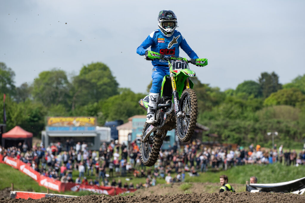 Qualifying 5th in MX1, Tommy was feeling much more like his usual self and the team had done a lot of testing with him prior to Foxhill. He had enjoyed some online banter with old GP sparring partner and wildcard Jeffrey Herlings, and after getting a great jump from the gate it was the #100 that cut across the front of the #84 into the first corner: