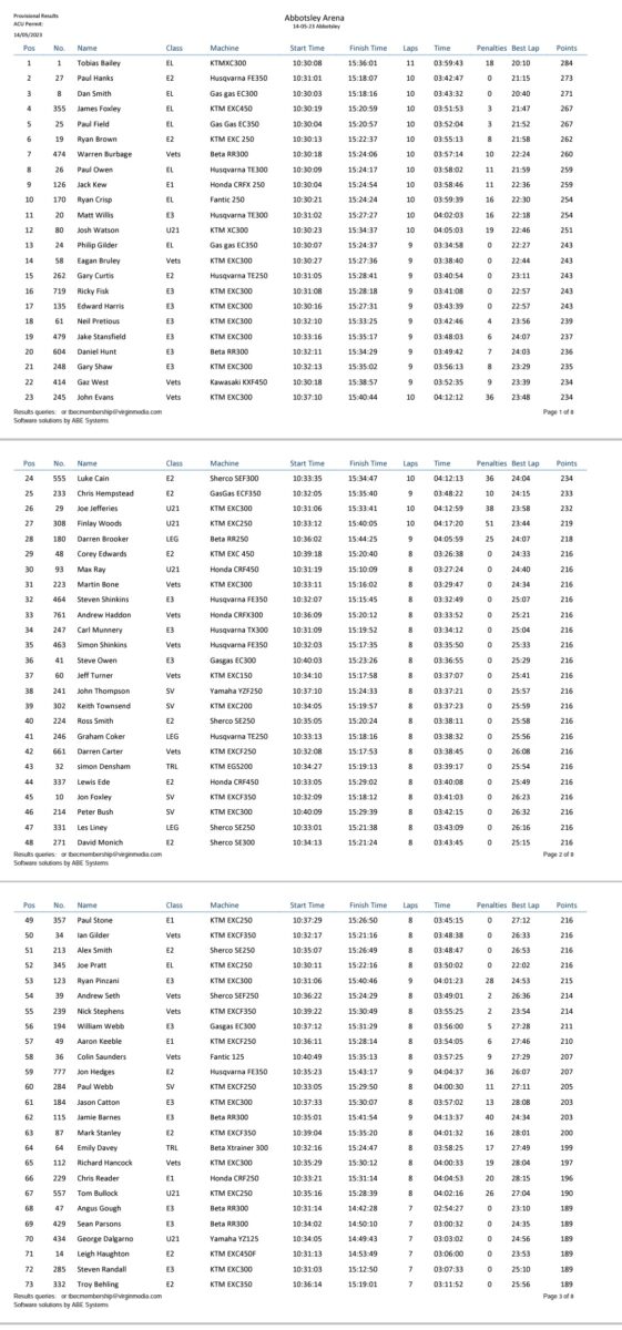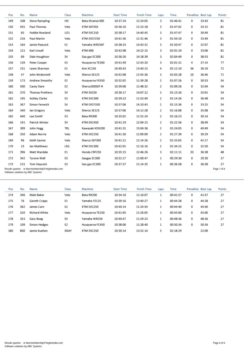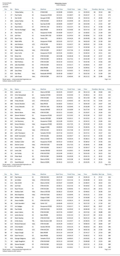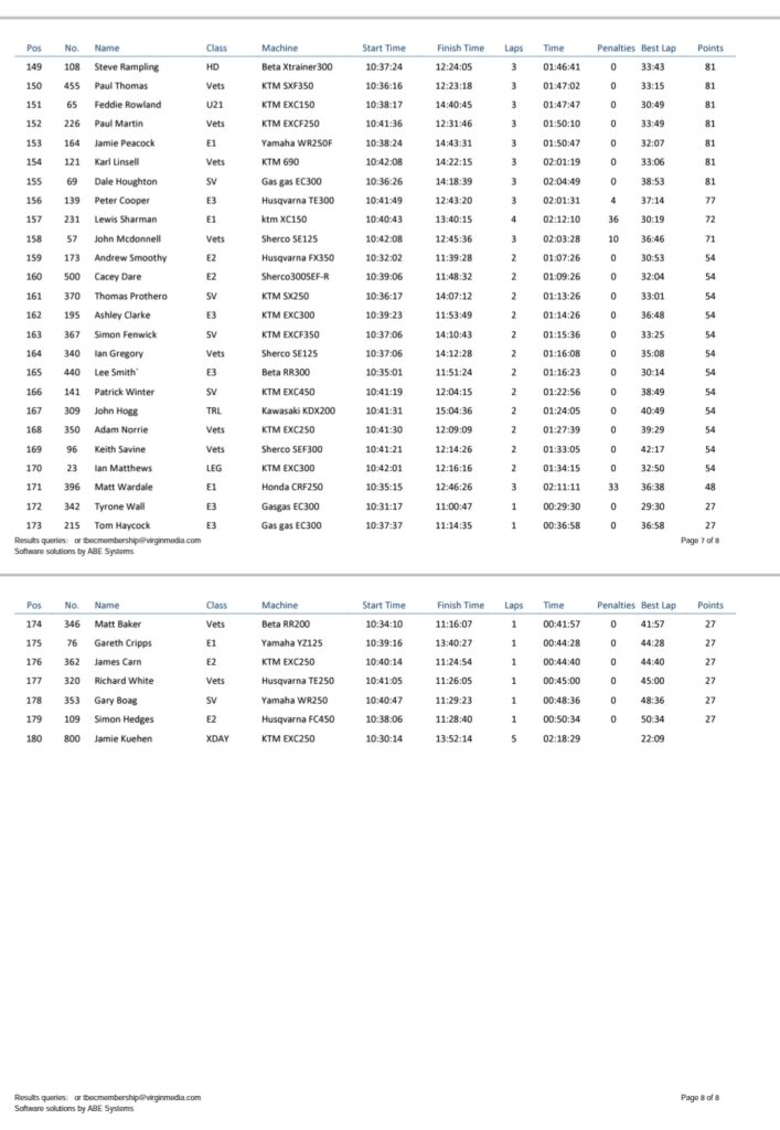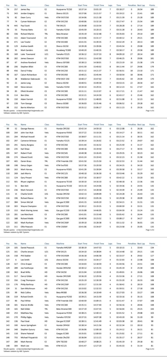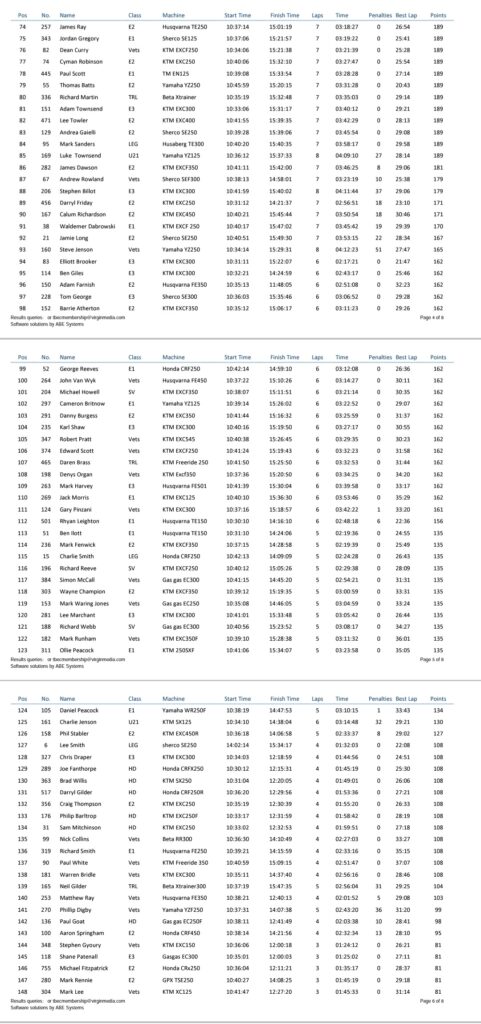In the E1 class, Jack Kew #126 forced his Honda up the order to head up his group with a class win. Similarly, Paul Hanks put in some consistent laps to take the E2 class with a best lap time of 21 minutes 15 seconds, just edging out #19 Ryan Brown. In the E3 class #20 Matt Willis clearly took the win with 10 laps completed from the 9 laps of class runner-up Ricky Fisk #719, and third man Edward Harris #135. It was the Beta #180 of Darren Brooker that claimed the ‘Legends’ class win covering nine laps from the eight of Graham Coker #246. As always, the Vets showed their experience with Warren Burbage #474 completing 10 laps and taking the class win on his Beta, with Eagan Bruley #58 as runner up. As you might expect, the Under-21 class was hotly contested between Josh Watson #80 and Joe Jefferies #29 with Watson edging it on time and fewer penalties. In the SV class #302 Keith Townsend gained the same amount of championship points as John Thompson #241, but it was the latter who took the class win with a slightly quicker overall time. Finally, in the Trail class, Simon Densham #32 took the win.