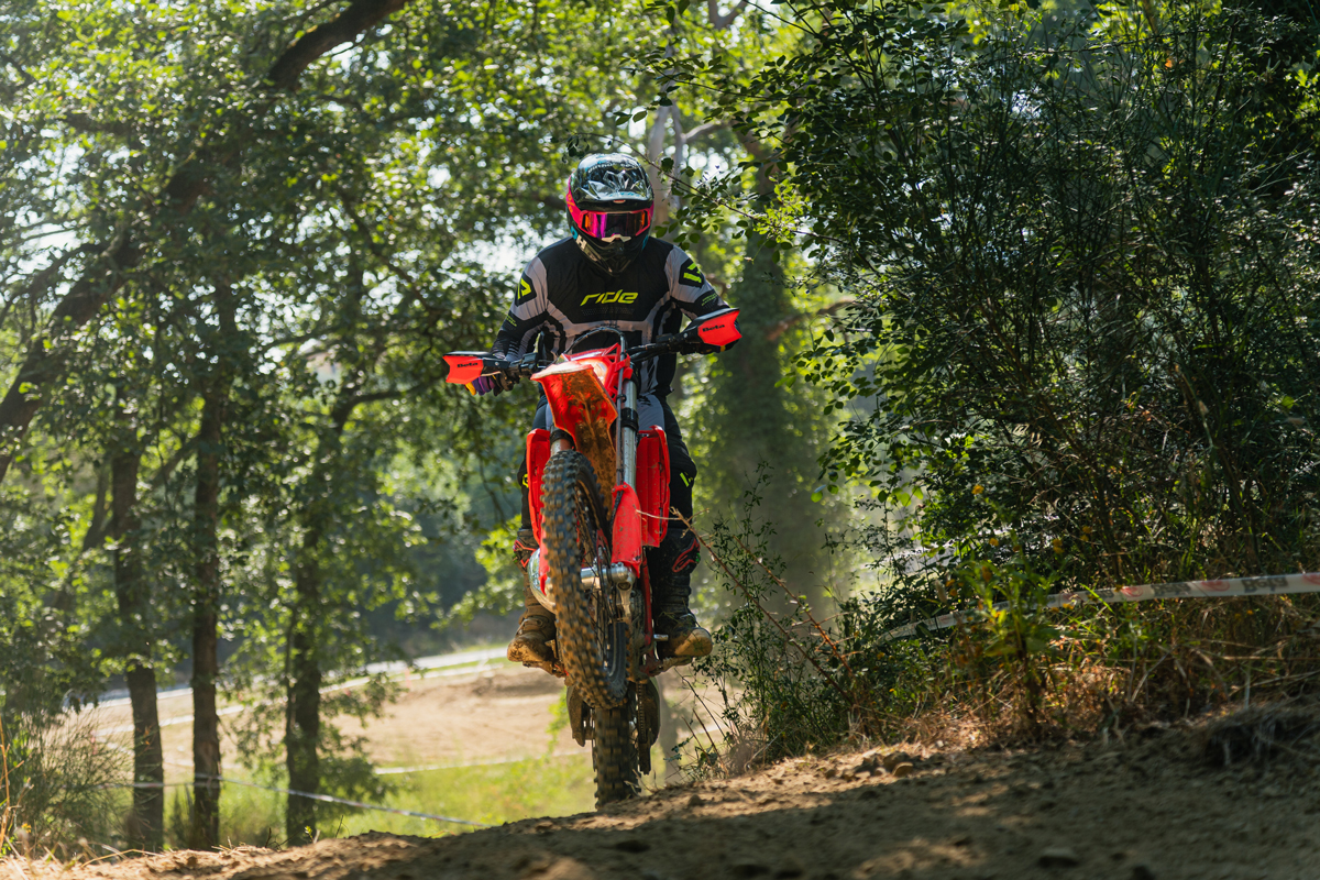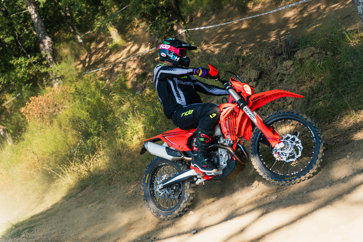 First up for me was the Beta 350 4-stroke enduro, and it instantly blew me away. I’m not an enduro rider by any means, but the 350 4-stroke worked brilliantly in the tight wooded sections where we were testing. It handled the roots with ease, delivered usable power all the way through, and inspired so much confidence that I didn’t want to get off the bike. I stayed out as long as I could!