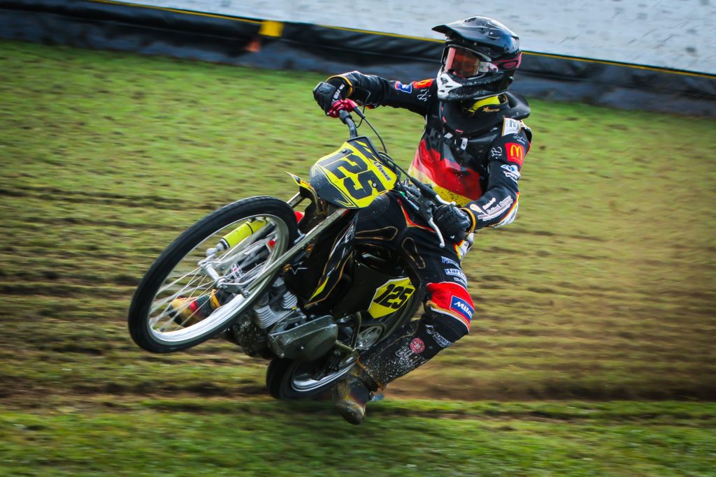 A courageous ride by Theo Pijper saw him finishing in third place despite having dislocated his shoulder dealing with the ruts and deep loose grass. Amazingly he managed to complete the race before collapsing in great pain at the finish. Stichauer was also in the wars and a twisted knee required the attention of the medical team after the race. Chris Harris retired in last place when his aching arms were unable to cope with the heavy conditions.