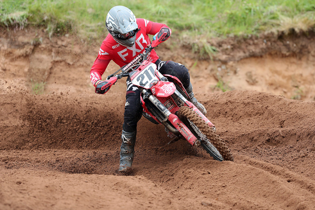 What a contest the 2021 MX2 class is proving to be as it’s not only 2T 250cc machine v 250F Four-stroke power but also experience v youthful talent and exuberance. At Norley though it was 2T 250cc experience which was to come out on top as Nev Bradshaw took the overall win. After having had a run out at Foxhills on Saturday in the ACU Revo British Championship, he then travelled North to Cheshire. Setting the fastest qualifying time, Nev then took the opening moto win of the day ahead of Rossi Beard, Shane Carless, Henry Williams, Ray Rowson, Corey Hockey and Josh Peters. In moto two it was then a super FUS battle all the way with Carless stalking Bradshaw before zipping past for the win with just two laps remaining.