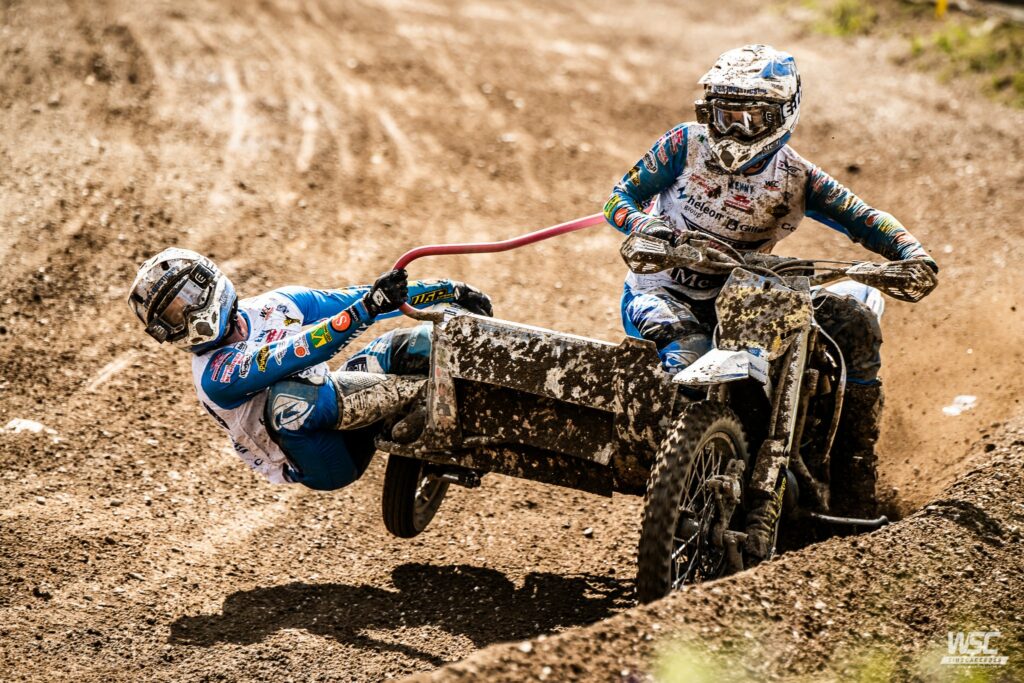 Amazingly, Daniel Willemsen flew from the gate to head the pack up the hill to the first turn. It was a gold-plated hole-shot again for the ten times champion, followed by Etienne Bax/Ondrej Cermak from Marvin Vanluchene/Robbie Bax and Marco Heinzer/Reudi Betschart. The Swiss pair were physically strong and proved to be a thorn in the side of the front runners for many laps. Gert van Werven and Ben Van Den Bogaart slotted third and set after Willemsen and Bax. It was not long before Bax took over at the front, just as both Vanluchene and Veldman hit mechanical problems. It appeared something had failed on the rear end of Vanluchene’s bike, but Veldman managed to recover, albeit one lap adrift. He and Glenn Janssens battled on, and were eventually able to un-lap themselves to claim twelfth place and valuable points. All this time, Koen Hermans and Nicolas Musset had been battling for supremacy, fighting with Van Werven and the Prunier boys in the early stages of the race. Once past both Willemsen and Gert, had Etienne in their sights. This was enough to spur them on, and they caught and passed the series leader at two thirds distance. Brett Wilkinson/Joe Millard also made great ground from the word go and looked strong. They were fighting hard to get the better of Heinzer/Betschart. Well in the hunt for fourth place, they hit trouble on a hill and stopped. Also caught up in this incident were Stuart Brown/Josh Chamberlain. They made it through to eighth place, with Wilkinson recovering for points in seventeenth.