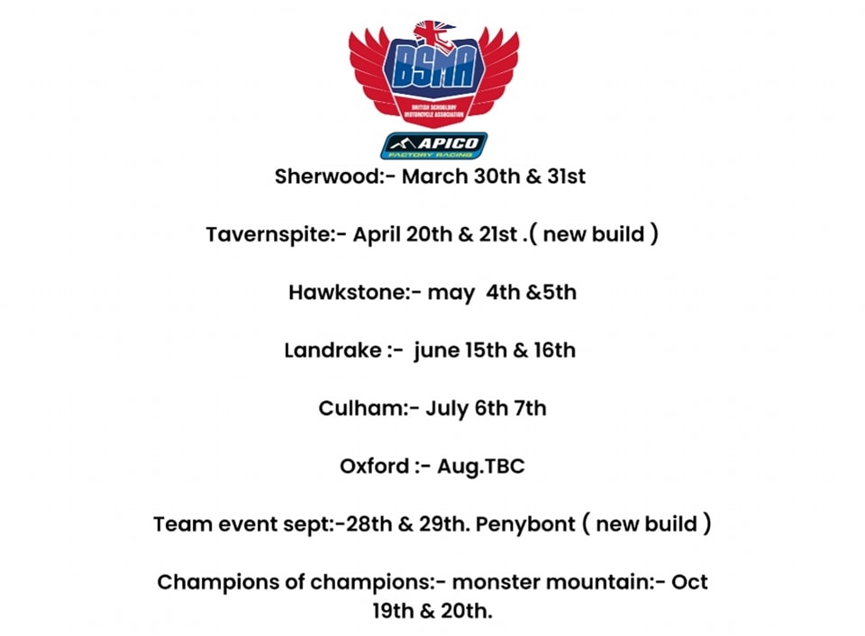 The BSMA Apico Nationals series has announced its dates and most of its venues for 2024.