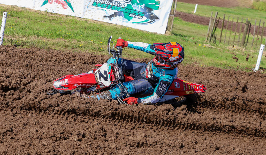 The popular Cornish circuit gave 7 maximum scorecards! Mark Morris in the over 45 Vets made his intentions clear by storming the Apico Holeshot in Moto 1, ousting similarly mounted Kawasaki Dain Traylor across the chalk. Traylor took a decisive dive down the inside into turn 3 to take the lead in this mixed age class, but it was short-lived as the freight train of Luke Spence, Sam Callow, Pete Bully and Lee Hocking all came past in the tricky conditions. Spence went down letting Callow take control, Morris was still in there battling with Bully and Hocking before Hocking pulled out with an issue.