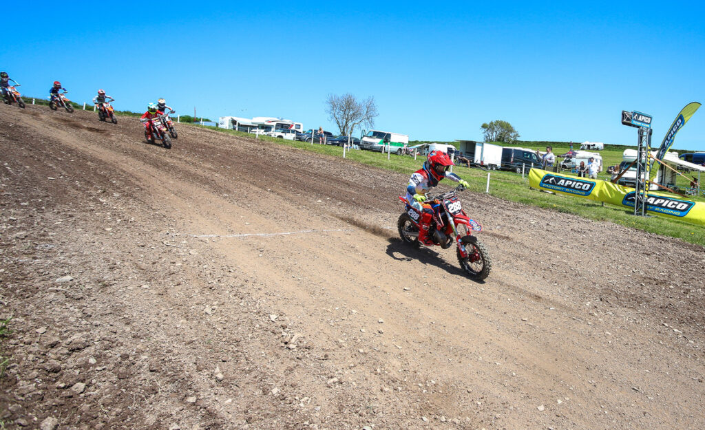 Final group on both days racing with the toughest track conditions went to the Big wheel 85’s and the one claiming the Apico Holeshot prize was Stanley Siebert but he was quickly demoted by Archie Congdon. Chris Brindley and Danny Flude both got past Siebert and traded places for the next 3 laps before Flude got the upper hand and started to reel in Congdon. Siebert had issues but pulled it back as the race went on having dropped to 7th by the end of lap 1 he was back to 5th by the flag. Silas Mandeville nearly got caught at the line by Siebert but just held on for 4th. Finley Stead made it hard work moving up from a poor start to 8th by the end a few seconds off 7th placed Harley Quinn with Jacob Luker not too far in front.