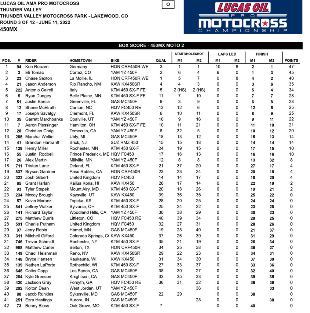 By virtue of his unexpected moto win, Roczen vaulted to the top of the overall classification, where his 2-1 moto finishes were enough to give him the 21st win of his career and his fifth victory at Thunder Valley, where he also emerged triumphant one year ago. Tomac earned a runner-up finish at his home race (1-3), while Sexton’s result in the final moto moved him into third overall (4-2).