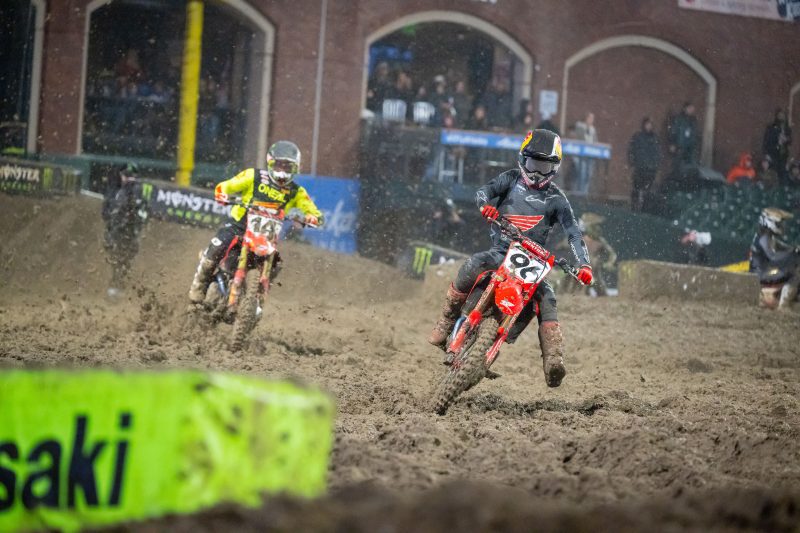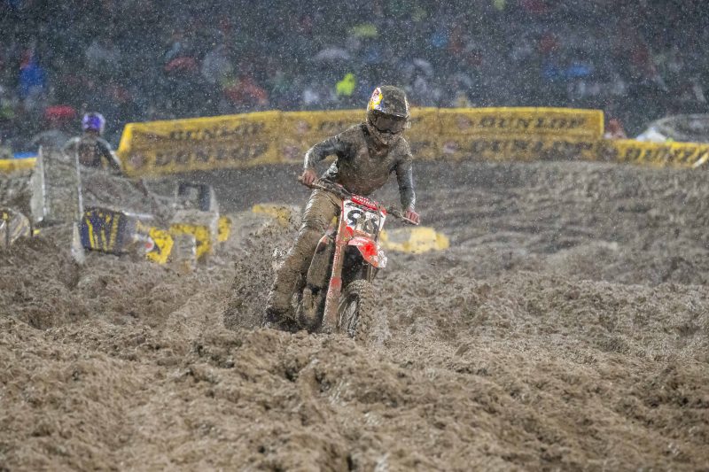 Conditions were atrocious for the shortened 450SX main event, and Jett and Hunter Lawrence found themselves mired in the pack early in the first lap—sixth and eighth when they completed lap 1. Falls and vision problems saw them shuffled back to 10th and 11th on lap 5. The brothers were close to one another for much of the race and even swapped positions, but in the end, the best Jett and Hunter could manage was ninth and 10th, respectively. On the positive side, Jett’s result was good enough for him to emerge second in the points standings, seven behind the leading Chase Sexton. Putting in an impressive performance was Phoenix Honda racer Dylan Ferrandis, who charged through the muck to a sixth-place result.