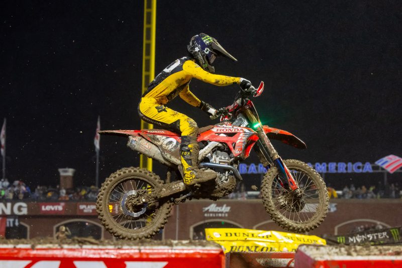 Shimoda started in fourth in the 250SX West main event but immediately went down. He remounted but came to a halt a few turns later with a technical issue that seemed to have resulted from the fall. SmarTop/MotoConcepts Honda’s Carson Mumford threatened for a podium position for a while but ultimately slipped to a career-best fifth, while his teammate Mitchell Oldenburg managed a top-10 finish.