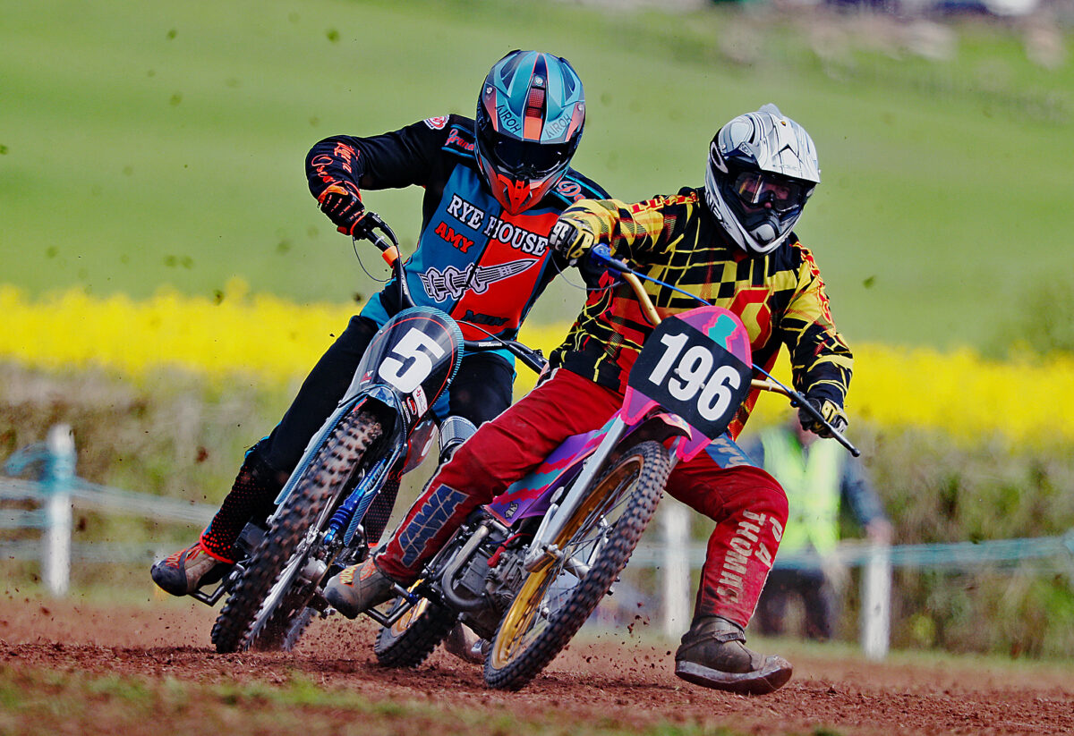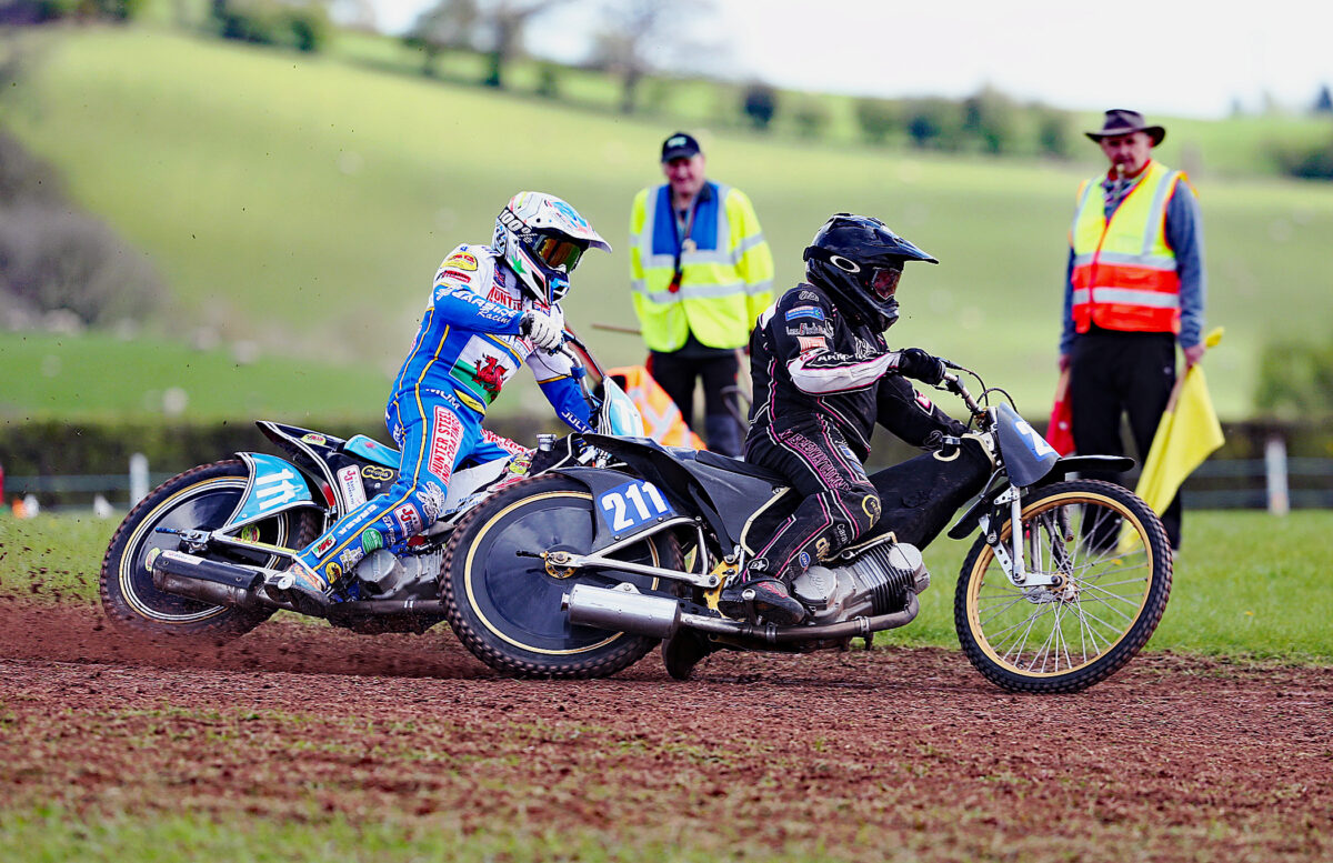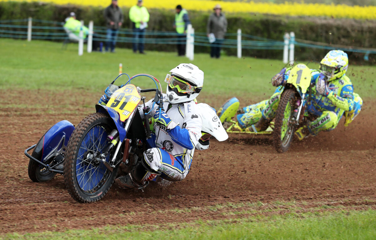 The 500cc sidecar racing at Pencombe was to be equally as exciting and dramatic. After Mitch Godden/Paul Smith had been out gated then forced to chase and pass Josh Goodwin/Scott Goodwin in their opening heat, they then met Richard Webb/Anthony Goodwin in a super second heat. Webb had also won his first outing, and he got the jump on Godden to hit turn one in pole position. From here onwards, the chase was on, but Webb rode a super cool race to deny Godden’s every move and take a great win. Incredibly, just yards after crossing the finishing line, Webb’s outfit then shed a chain!