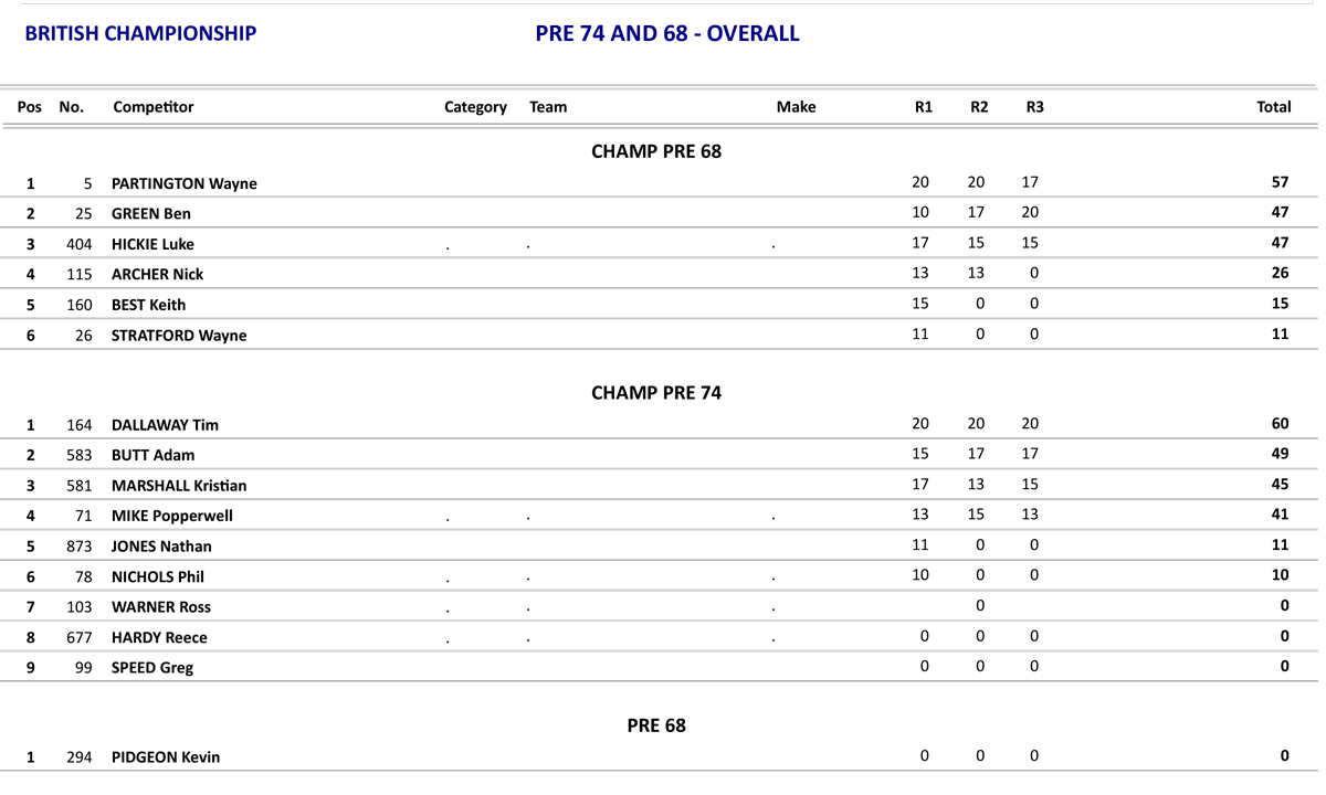The Pre 68 & Pre 74 Classic British Championship class saw three races over the two days which was run as a combined race and it proved to be a good weekend for the defending Pre 68 Champion Wayne Partington on his 360 CZ Twinport who went in to the penultimate round with a thirty three points lead over Lee Kelly who was a nonstarter, but Partington knew especially in the difficult conditions he had to be very cautious and make no mistakes which was exactly what he did by winning the opening two races only to be beaten in the last race by the 500 BSA of Ben Green but it was Partington who took the overall and with it he had done enough with a round to spare to become the 2025 Pre 68 Champion again with Green who was tied on points with Luke Hickie taking second overall by virtue of the better result in the last race. The Pre 74 Championship class saw Tim Dallaway, who last won this Championship back in 2016, go into the penultimate round with a sixteen-point advantage over Rhys Walker, who was also a nonstarter. Kristian Marshall was lying third in the Championship and did lead the opening race on his 400 Maico early doors, but the old faithful Hickie 500 BSA of Dallaway was to pass Marshall, powering up one of the hills. Marshall did fight back, but a mistake saw him drop back. Dallaway was to go on to take the chequered flag with Marshall after his mistake, coming back to take second with Adam Butt on his 350 Hickie BSA, taking third. Dallaway, who had plenty of local support, seemed to relish the wet conditions and was to go untroubled in the other two races and was to take a clean sweep of wins, and with it was declared the 2025 Pre 74 British Champion. Butt took second overall on the day, with Marshall third overall.