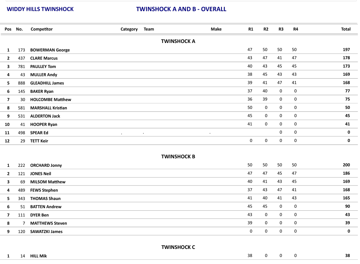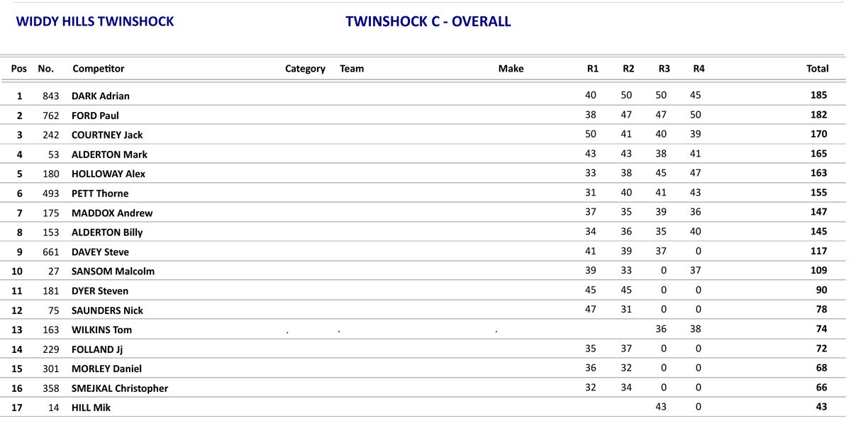 The Twinshock C class was highly contested, with Jack Courtney and Paul Ford taking a win each, with Adrian Dark on his 490 YZ Yamaha winning the other two races, which gave Dark the overall from Ford, with Courtney third overall.