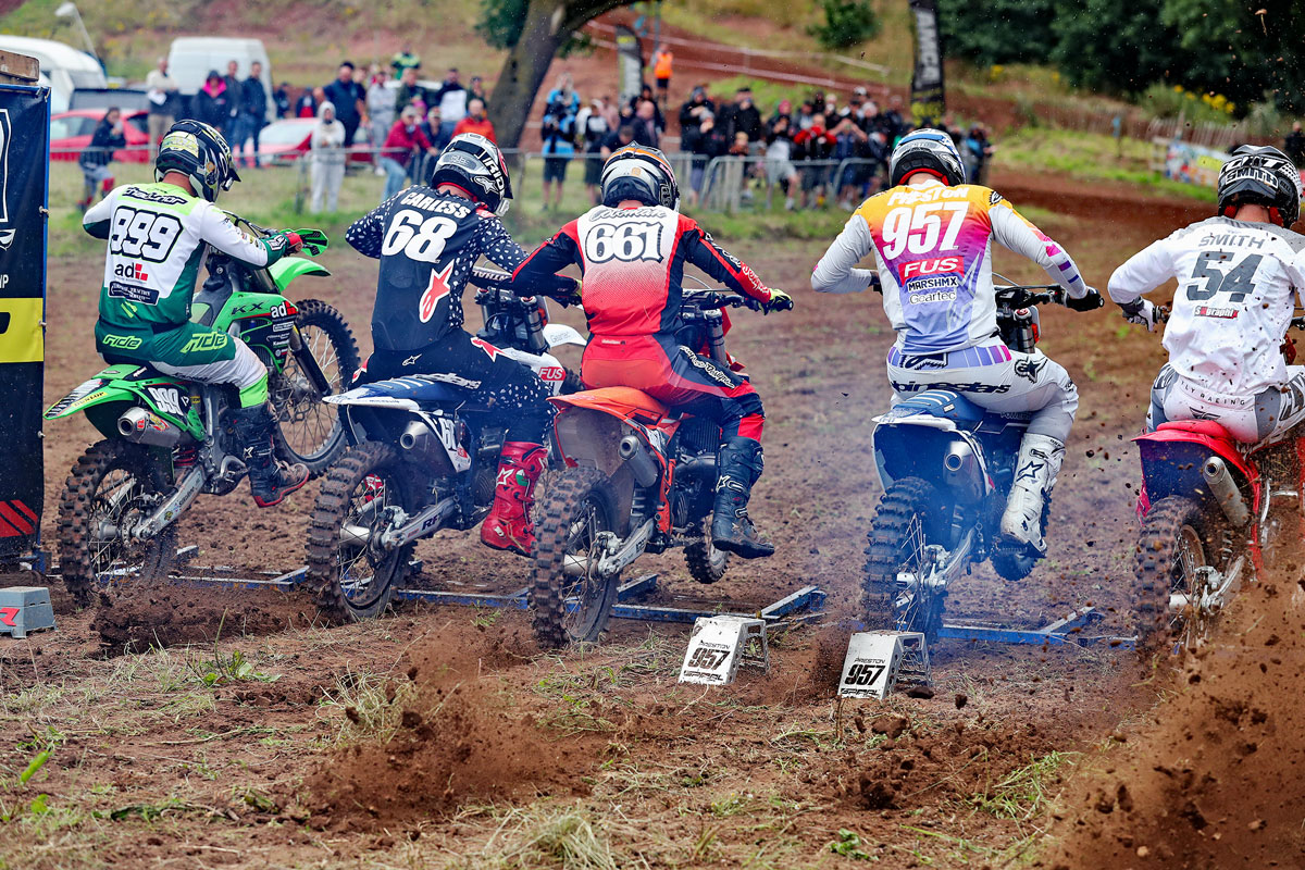 Making his best start of the day, James led the way and despite heavy rain now falling he looked to be comfortably on his way to another win. On a lap seven though his handlebar clamps became totally loose forcing him out of contention both for the moto and overall win but more importantly possibly the title race! With the unlucky KTM rider scoring a DNF, Simon Lane took what could well prove to be a vital win chased home by Ryder, Meakin, Smith, Blakeley and Brian Staples. That result meant it was Simon Lane, Ryder and Smith on the podium and Ryder also continues to top the Vets Over 50’s class.