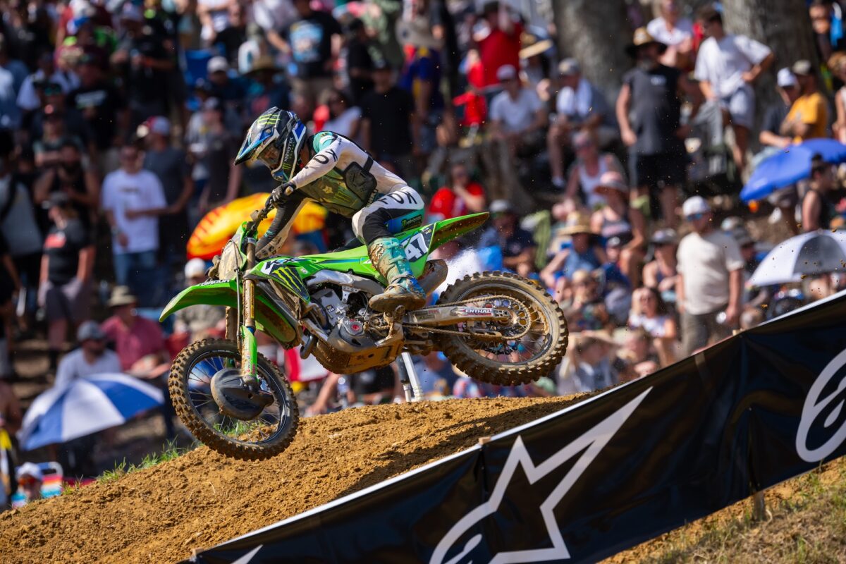 While Jett was able to close in on Hunter through the middle of the moto, the elder Lawrence responded and soon stabilized his lead at just over three seconds. Cooper slowly lost touch and soon dropped more than 10 seconds back, with Hampshire closing in from fourth. As the moto entered the final five minutes, Hunter Lawrence added to his advantage, which approached nearly 10 seconds, while Hampshire caught and passed Cooper for third.