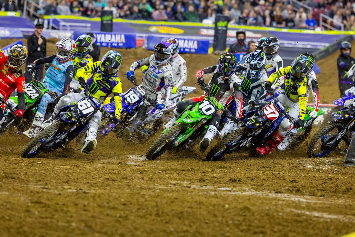 The 20 Minutes + 1 Lap 450SMX Class Main Event began with Honda HRC Progressive’s Hunter Lawrance out front with the holeshot ahead of Red Bull KTM Factory Racing’s Jorge Prado and Progressive Insurance Cycle Gear Suzuki’s Ken Roczen, last weekend’s winner. Behind them, points leader and Red Bull KTM Factory Racing rider Eli Tomac started ninth. Prado went on the attack and briefly got by Lawrence for the lead, only for the Australian to fight back and regain the top spot. Roczen, meanwhile, took advantage of this and made it a three-rider battle for the race lead, as the German native made his way by Prado and then leaned on Lawrence to grab the lead. Prado slotted into second as Lawrence regrouped in third.
