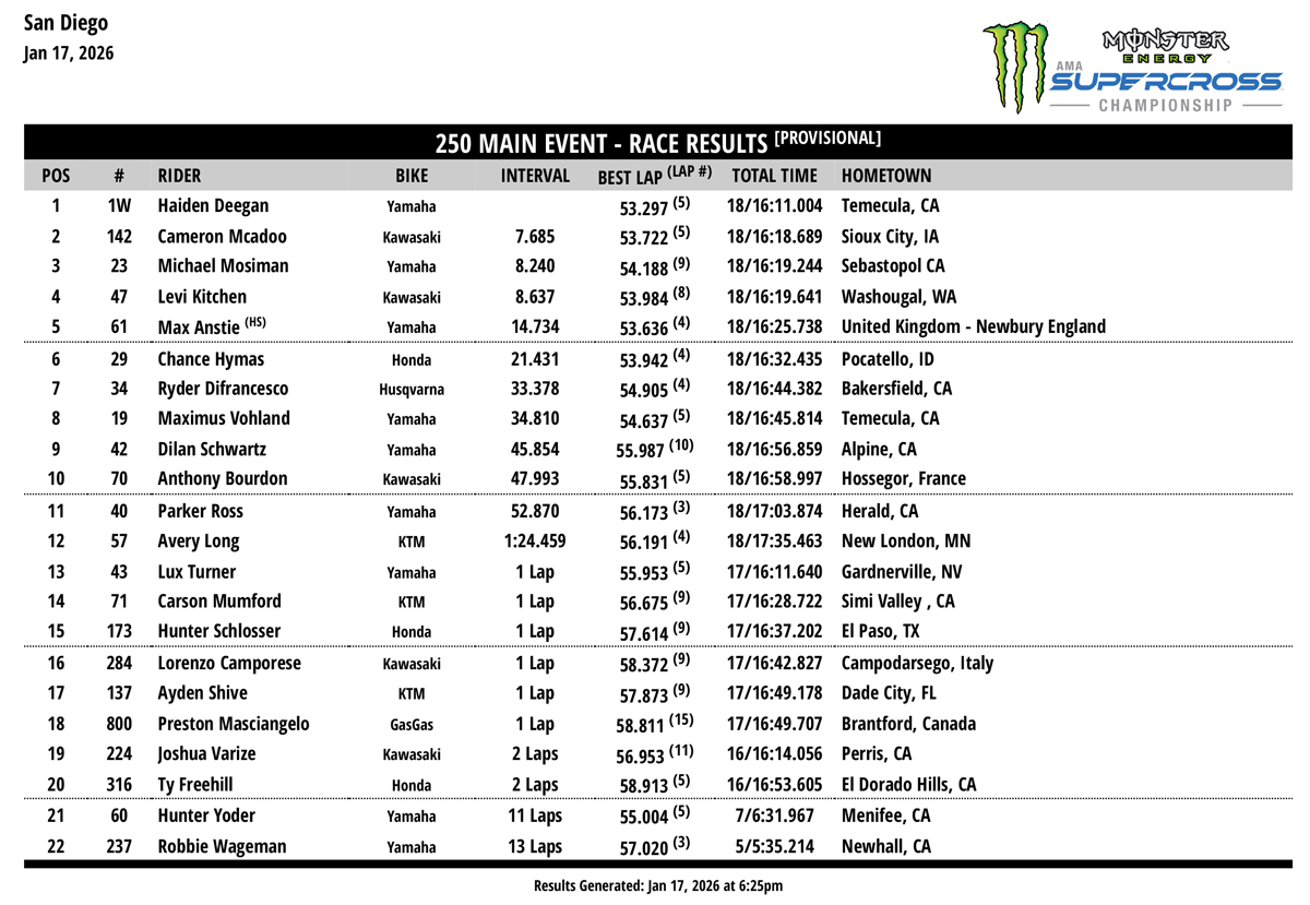 Deegan went unchallenged and took his first win carrying the No. 1 plate by a margin of 7.6 seconds over McAdoo, who finished last (22nd place) at the Anaheim opener and is coming back from a torn ACL suffered last season. Mosiman recorded his 11th career podium finish in third. Anstie battled back to finish fifth.
