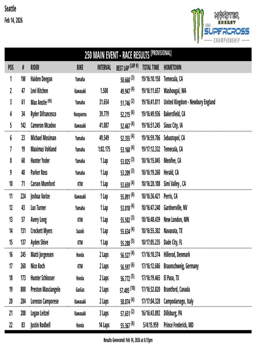 Deegan stormed to his fifth consecutive win by 1.5 seconds over Kitchen, who became the first fellow competitor to give Deegan a significant challenge during his run of dominance. The near-miss in front of the hometown crowd continued a recent surge for Kitchen, who now has three straight runner-up finishes. Anstie rode to a quiet and comfortable third-place finish, his first podium since winning the opening race of the season.