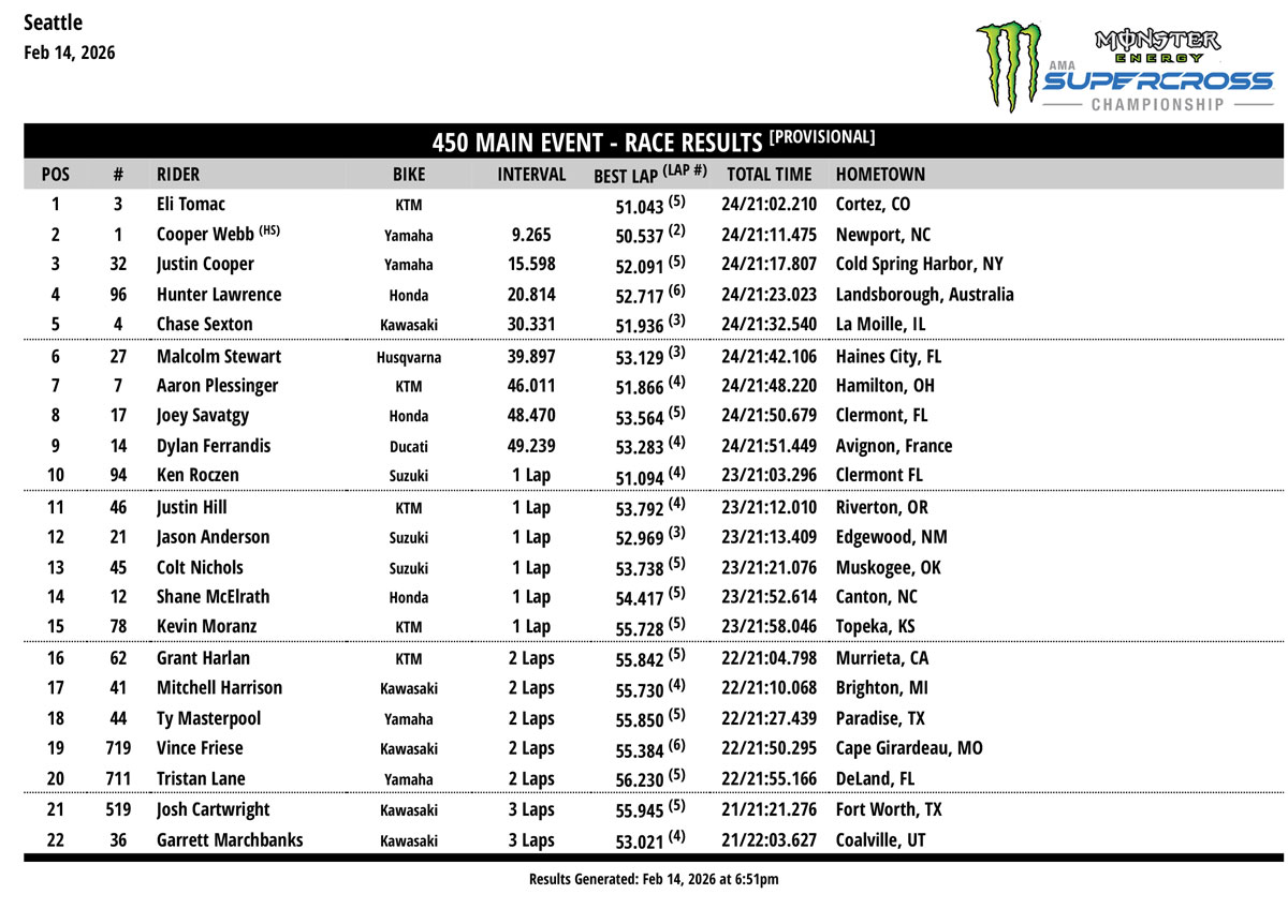 The incredible atmosphere encapsulated the most action-packed night yet in the Monster Energy AMA Supercross Championship, where the always challenging Seattle track conditions became a central player in the battle for victory. After a grueling 20 Minutes + 1 Lap Main Event, it was Red Bull KTM Factory Racing’s Eli Tomac who prevailed with his third victory of the season, wrestling the lead away from Monster Energy Yamaha Star Racing’s Cooper Webb before soldiering home to a bounce-back win following an adversity plagued outing last weekend.