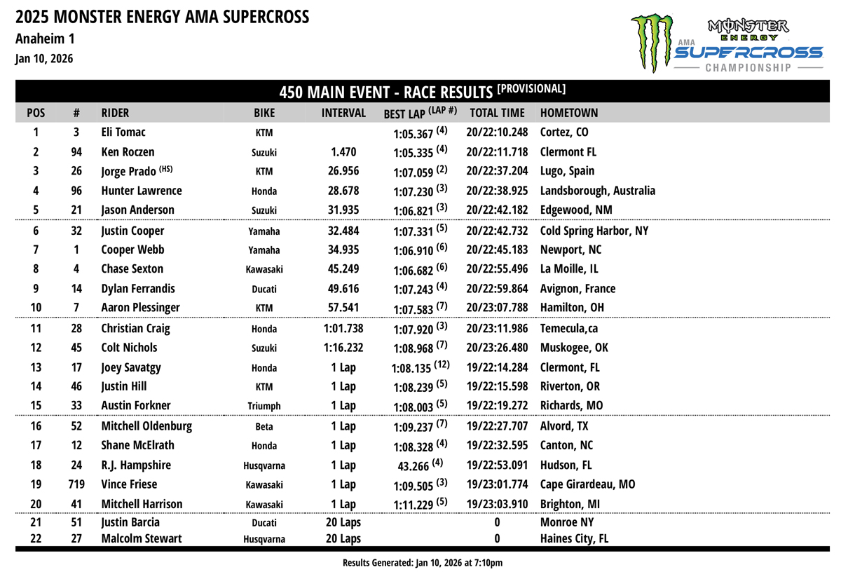 Tomac took his second Anaheim 1 victory by a margin of 1.4 seconds over Roczen, while Prado leveraged the holeshot into the single-best-performance of the Spaniard’s U.S. racing career and his maiden Supercross podium in his seventh start. Following the race, Prado’s KTM failed the post-race sound inspection, which resulted in a penalty from the AMA of three championship points. Prado retained his third-place finish.