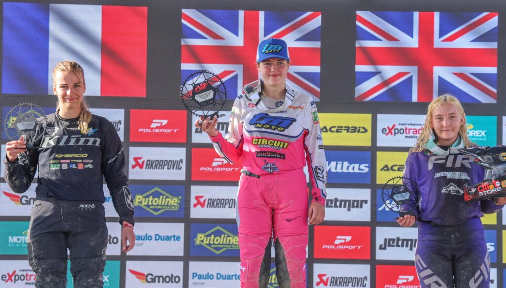 In the Expotrade FIM Junior Women’s Enduro World Cup, Electraction TM’s Elizabeth Tett raced clear to a 10-minute margin of victory. Lorna Lafont (Sherco) took second, while Welsh youngster Delun Davies claimed her first podium result on home soil. Lea Meier (Sherco) placed fourth.