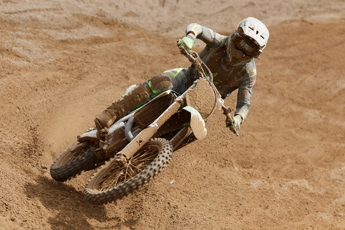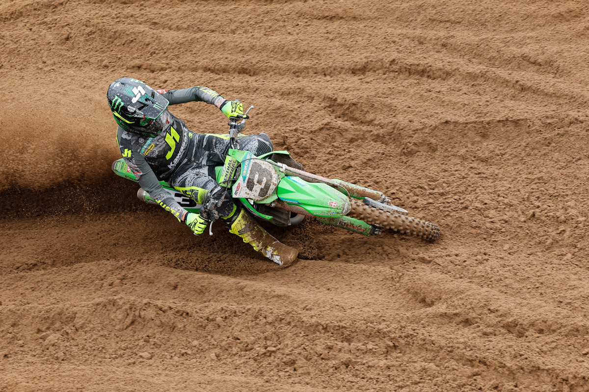 The Frenchman already gave notice of his intentions by posting the fastest lap time during the morning Warm-up to dispel the previous day’s frustration, and he used KX450-SR traction superbly in both motos, sweeping around the outside of turn one to emerge top-six each time from the disadvantageous outside-gate handed to him by his misfortune in Qualifying. In the first moto, he surrendered a couple of positions on the opening lap as he sought to settle in traffic, but by mid-moto, he was on the charge, an immaculate pass on the series leader securing fourth on lap eleven.