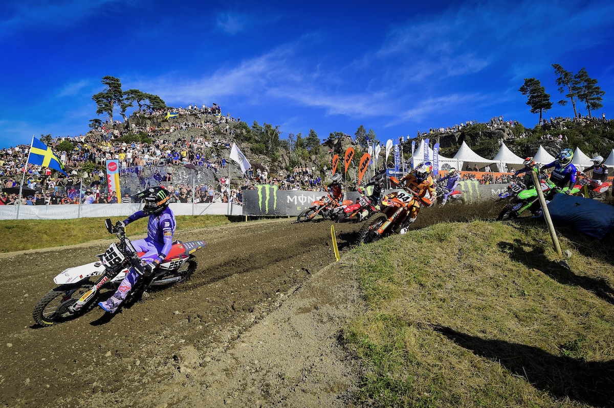 The Glimminge Motorstadion outside the picturesque town of Uddevalla was bathed in glorious sunshine for the first day of action at the MXGP of Sweden, and packed hillsides of fans made for a stunning atmosphere during the Saturday Qualifying Races for the sixteenth round of the FIM Motocross World Championship! Any travelling French fans would have been particularly delighted as they celebrated a win in both Grand Prix classes!