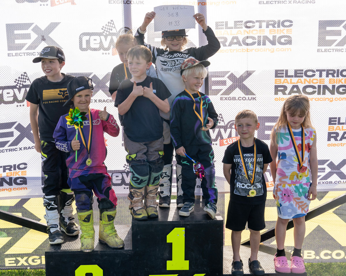 Mixed in with the Open 5-6’s the Revvi 16″ Open 7-8 riders were right in the mix at all times with plenty of drama going on during the weekend. Emerging from it all with the title though was Vivienne Western who rode tremendously to keep Henry Spencer at bay in second and race one winner Ava Radley in third. Emelia Bryant joined the fray on Sunday and won all three races, ending the weekend in fourth and as the race five winner the chance to be the first person to ride the brand new Revvi 18″ in public which she throughly enjoyed.