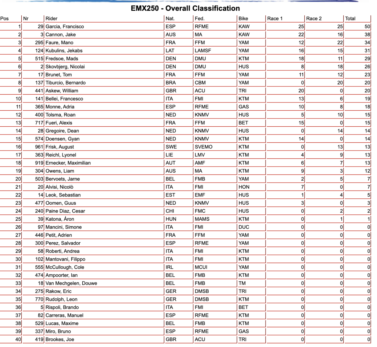 EMX250 Championship – Top 10 Classification: 1. Francisco Garcia (ESP, KAW), 50 points; 2. Jake Cannon (AUS, KAW), 38 p.; 3. Mano Faure (FRA, YAM), 34 p.; 4. Jekabs Kubulins (LAT, YAM), 31 p.; 5. Mads Fredsoe (DEN, KTM), 29 p.; 6. Nicolai Skovbjerg (DEN, HUS), 26 p.; 7. Tom Brunet (FRA, YAM), 23 p.; 8. Bernardo Tiburcio (BRA, YAM), 20 p.; 9. William Askew (GBR, TRI), 20 p.; 10. Francesco Bellei (ITA, KTM), 19 p.;