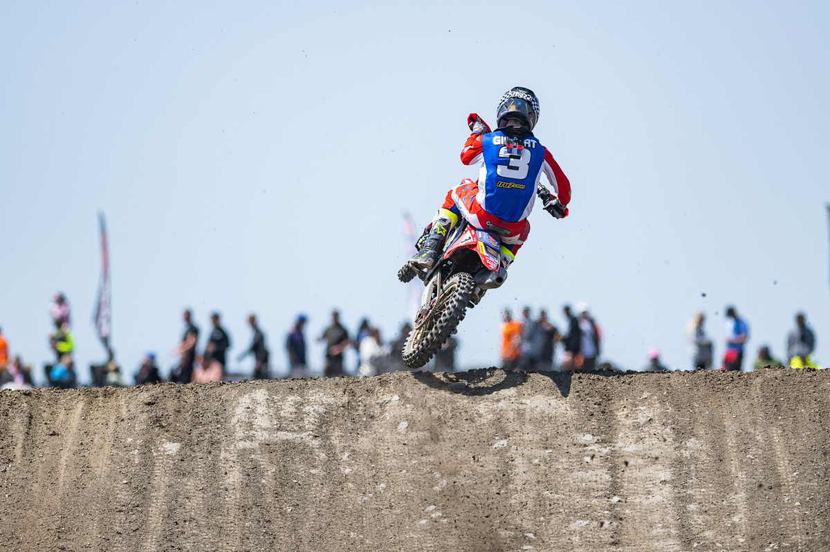 Kullas got the holeshot at the start of the first combined MX1 and MX2 pro race but was quickly passed a quarter of the way around the opening lap by Mewse and then by his teammate Gilbert, who had gated third, slipped by Kullas before the end of the lap. While this happened, John Adamson (ASA United Gas Gas) got cross threaded in one of the deep ruts and dropped from fourth to tenth.