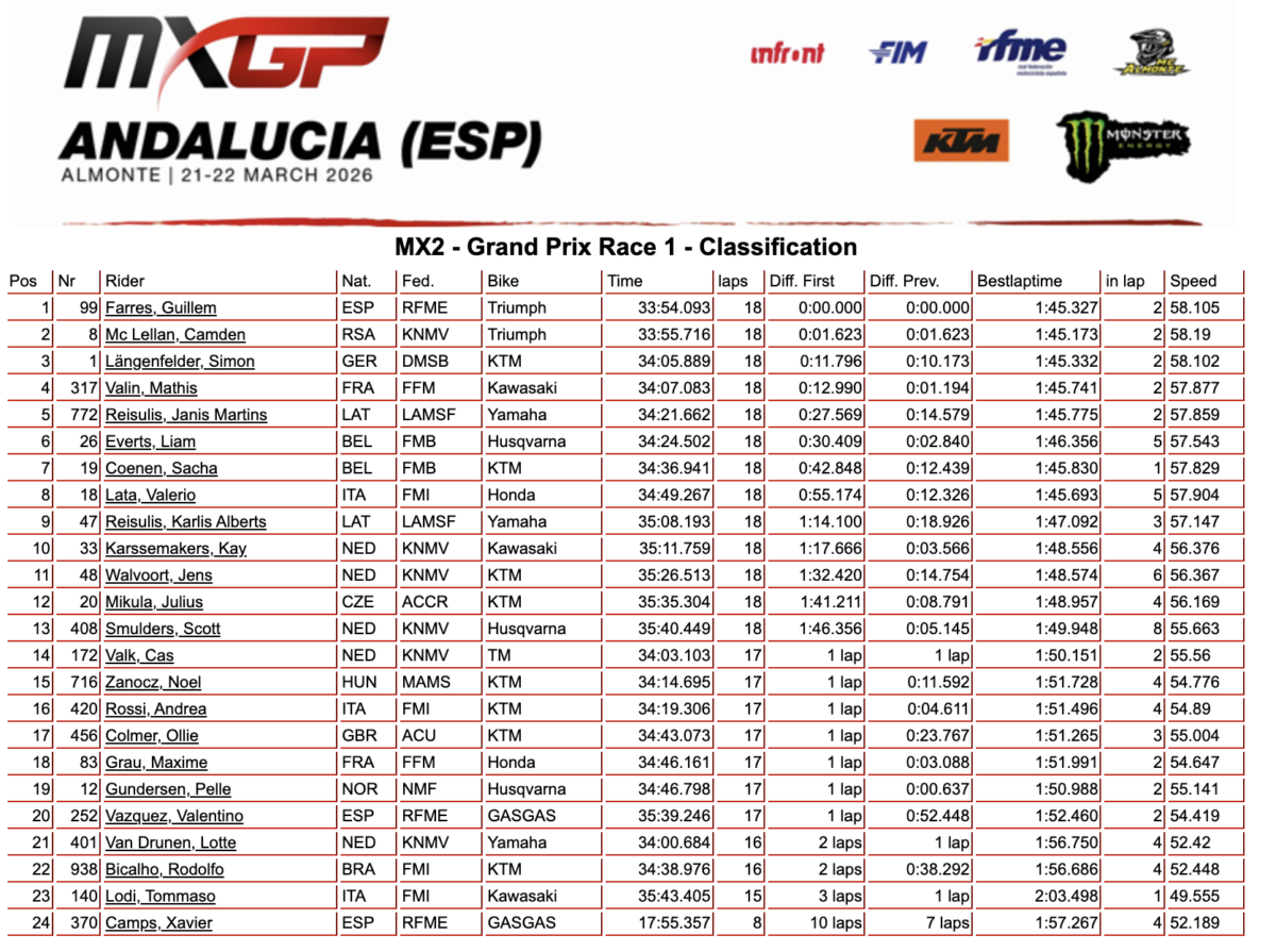 It was an epic battle at the Triumphs at the head of the field in Race 1 of the 2026 MXGP of Andalucia in Spain, but it was home nation hero Guillem Farres who took the win ahead of his team mate Camden McLellan, with Simon Laengenfelder in third.